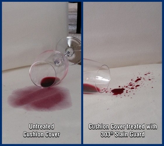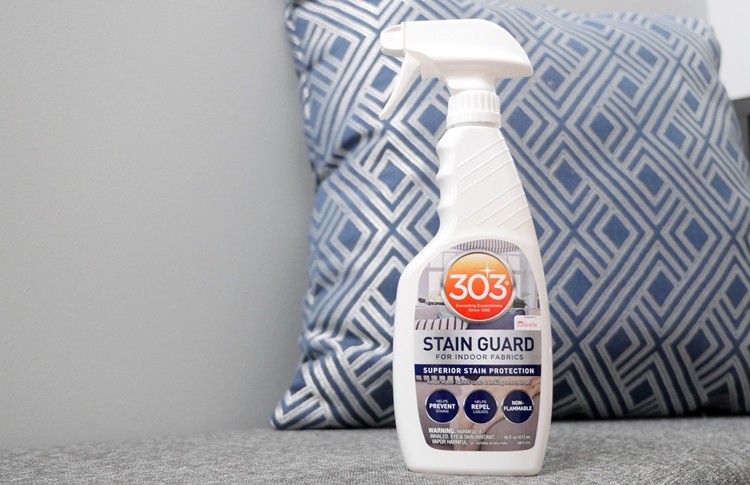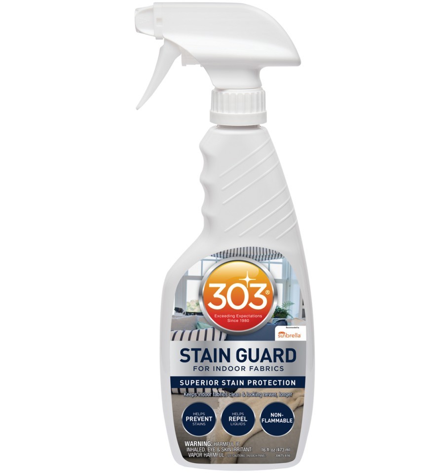 303 Stain Guard je upravená verze Fabric Guard 303 oceněná několika odborníky. 303 Stain Guard byl vytvořen speciálně pro ochranu povrchu čalounění ve vozidlech a obytných prostorách. Na rozdíl od klasických přípravků tohoto typu Stain Guard nevyžaduje vysoušení, není hořlavý a má příjemnější vůni. Chrání proti tvorbě potravinových skvrn, rozlitých nápojů nebo jiných kapalných nečistot.- Zabraňuje tvorbě skvrn po kávě, čaji, slanině, blátu, exkrementech domácích mazlíčků atd.