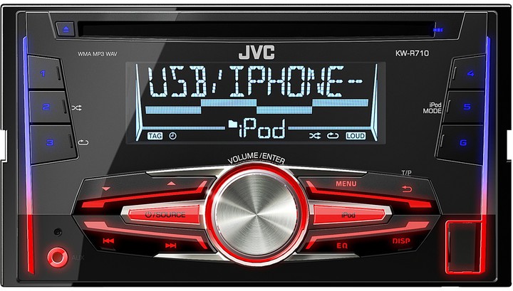 2-DIN автомагнитола JVC е оборудвана с CD механика, FM/AM тунер с поддръжка на RDS информация и естествено има памет за съхранение на радиостанции. Освен слушане на радио можете да използвате и предния USB порт за възпроизвеждане на музика, чрез който също можете да зареждате вашия смартфон (макс. 1A). Други музикални източници могат да се свържат и към AUX входа и не липсва и един линеен изход 2,5V. Качественият звуков изход е осигурен от вграден MOS-FET усилвател с мощност 4x 50 W, а настройването на звука според вкуса на всеки слушател е възможно чрез параметричен 3-лентов еквалайзер с дванадесет предварително зададени режима. С тази автомагнитола можете да възпроизвеждате широка гама музикални формати: MP3, WAV, FLAC и WMA.