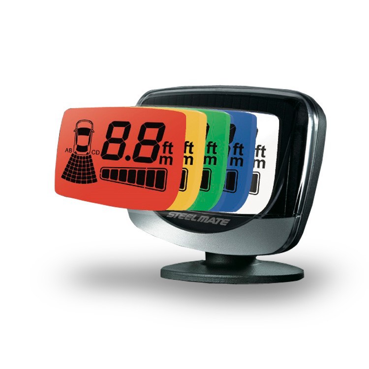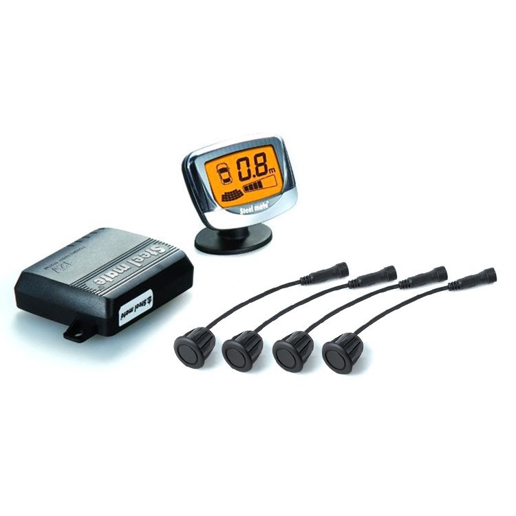 Асистент за паркиране Steelmate с 4 сензора и безжичен LCD дисплей T с обхват до 30 метра - предназначен за монтаж в задната броня на автомобила. Дисплеят променя цветното подсветяване в зависимост от разстоянието до препятствието. Колкото по-близо е препятствието, толкова по-интензивна е честотата на пищене, до момента, в който тонът става непрекъснат и на дисплея се показва - P. Дисплеят мига редуващо се с бяла и червена подсветка.