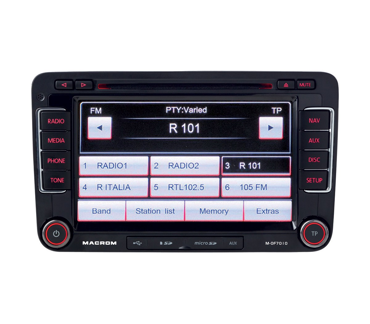 MACROM M-OF 7010 оригинална мултимедийна единица с 7" сензорен монитор, вградена GPS навигация и hands-free комплект. Устройството е адаптирано за Вашия автомобил, така че при инсталация да не са необходими допълнителни адаптери. Поддържа управление с бутоните на волана, свързване на оригинални парктроник сензори и поддържа показване на настройките на климатика и друга информация за автомобила на дисплея. Устройството включва AM / FM радиотунер, hands-free комплект, GPS навигация с TMC тунер, CD/DVD механика, слот за SD карти, USB вход и 2x аудио/видео вход. Bluetooth hands-free комплект показва телефонния указател на дисплея и поддържа стрийминг на музика от мобилен телефон (A2DP). 3D навигация IGO Primo с подробно картографско покритие на цяла Европа и TMC тунер.