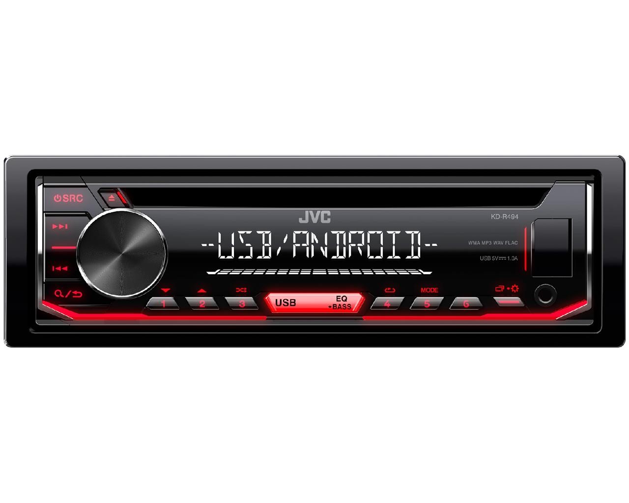Автомобилно радио с CD плейър и AM/FM тунер от JVC. Големият и лесно четим LCD дисплей ясно показва цялата информация в комбинация с червена подсветка на клавишите за лесно управление. Радиото позволява управление от волана, а мощният усилвател 4 x 50 W ще увеличи мощността на вашите говорители. Ако желаете да добавите външен усилвател, е наличен един 2,5 V изход. Качеството на звука е гарантирано от изцяло цифрова обработка на звука и времеви корекции заедно с 13-лентов графичен еквалайзер.Основни характеристики на автомобилното радио JVC KD-R494