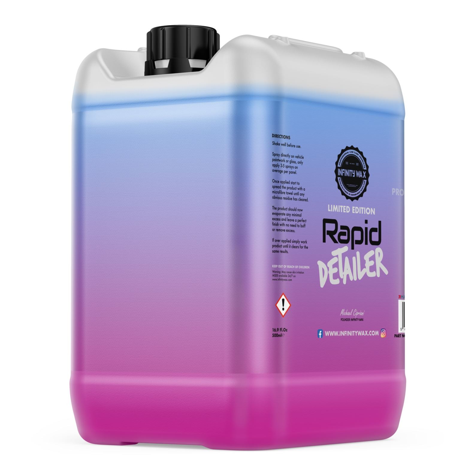 Rapid Detailer е най-универсалният и най-лесно използваемият защитен продукт от целия асортимент на Infinity Wax. Rapid Detailer оставя върху автомобила ви изключително лъскава повърхност на каросерията, която е гладка на допир, предлага отличен отвод на вода и краткотрайна защита на лака. Резултатите са още по-впечатляващи като се има предвид, че това се постига само с напръскване и полиране. Rapid Detailer е конципиран като макроемулсия на модифициран силоксан, която е комбинирана с още две ключови съставки за подпомагане на разнасянето и отстраняването на продукта без дълго полиране, което прави продукта прост, но мощен и също така много приятен за работа. Rapid Detailer споделя известна органична структура с естествената карнауба и като такъв е директно съвместим топър за почти всеки карнаубов восък на пазара. Благодарение на способността си да върне блясъка на уморен или леко замъглен лак за няколко секунди, този бърз детайлер е популярен в целия свят. Може да се използва при много ниски и при много високи температури. Безопасен е за използване върху стъкла и всички други външни повърхности на каросерията. Някои дори го използват за бързо напръскване и изплакване на джантите като бърза защита. Докато някои други бързи детайлери могат да са отлични в една или две области, Rapid Detailer се представя много добре във всичките три области. Издържливост 8 и повече седмици, значително подобряване на блясъка, отлична водоотблъскваща способност. Rapid Detailer може да се използва като средство за бързо съхнене чрез напръскване върху мокър автомобил и последващо подсушаване. Също така като бърз начин за почистване на външното стъкло и добавяне на краткотрайна защита, но най-вече на сух автомобил за постигане на най-добри възможни резултати. Една от най-добрите му характеристики е, че не изисква дълго полиране — остатъкът от детайлера просто се изпари и оставя безупречна повърхност без ивици всеки път.Основни характеристики