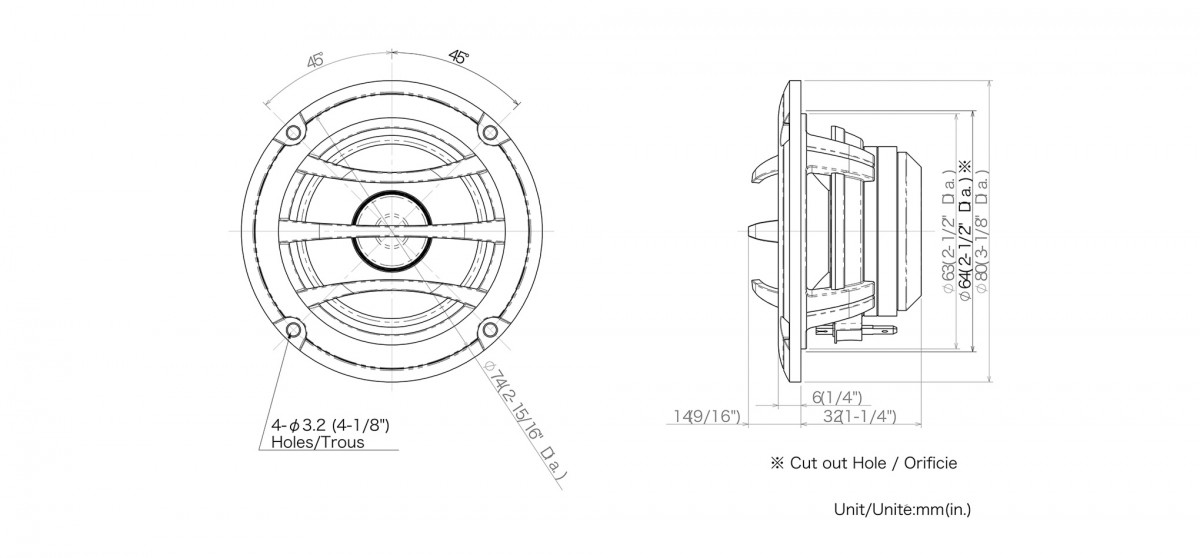 30 W RMS, 86 dB (SPL 2,83V/1m), 4 Ω, монтажна дълбочина 57,3 mm