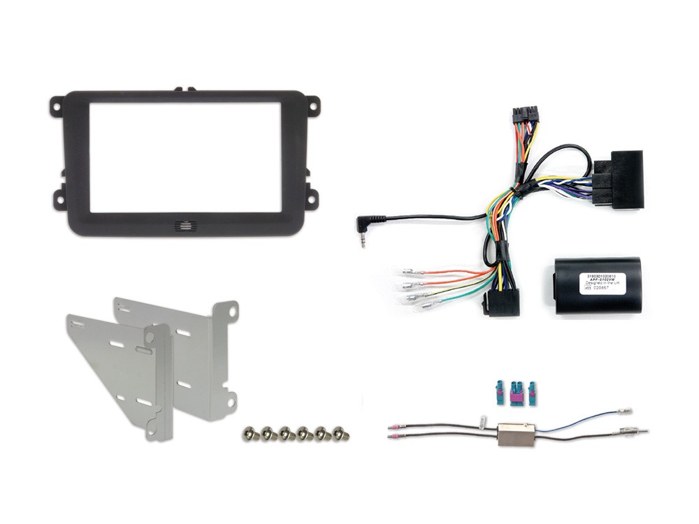 7" инсталационен комплект за VW Beetle, Caddy, T6 и други - KIT-7VWPQ. Налични са компоненти за механично монтиране, интерфейс за дистанционно управление на волана, който също така осигурява CAN за аналогова конверсия за ACC, импулсната скорост на автомобила и ръчната спирачка. Антенният адаптер е включен в опаковката.
