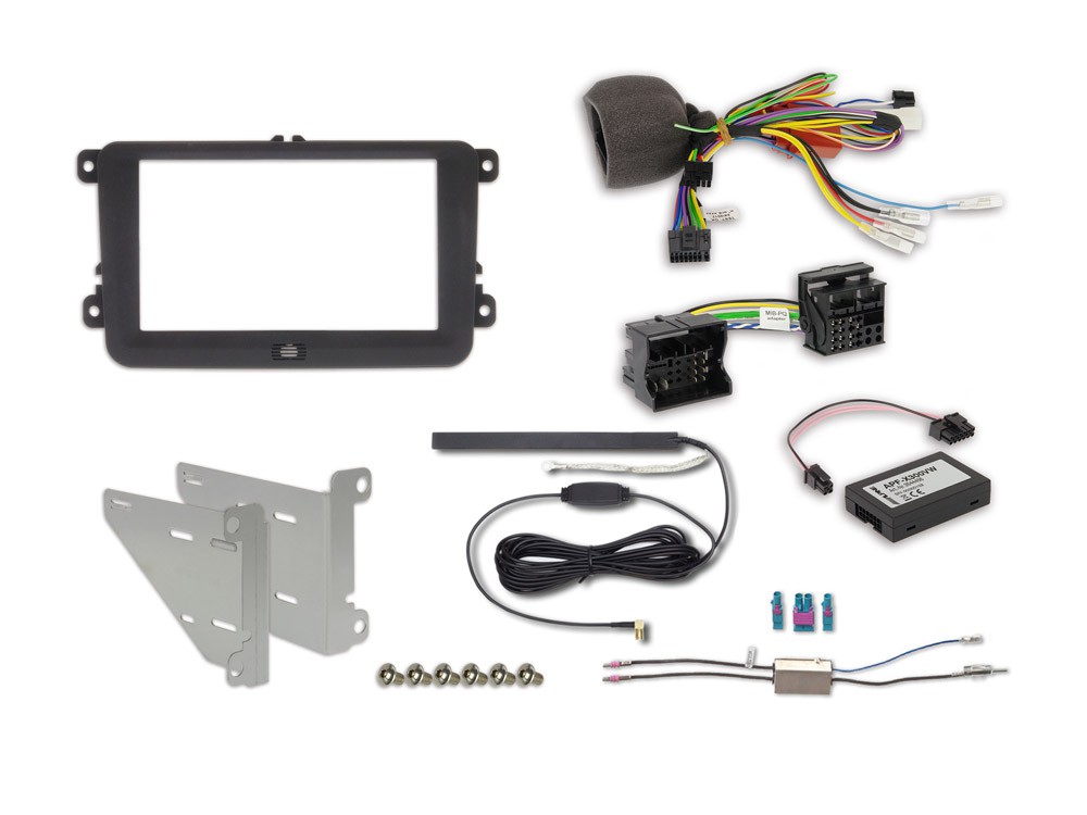 7" инсталационен комплект за платформи VW (MIB-PQ) - KIT-7VWXPQ. Серията 7" инсталационни комплекти за платформи VW (MIB-PQ) съдържа всички компоненти, необходими за инсталация и работа със INE-W997D / INE-W987D / iLX-700 в целевия автомобил. Налични са части за механичен монтаж, както и интерфейси, които позволяват запазването на климатичните и контролните дисплеи на VW, както и визуализацията на оптичните парктроници. Интерфейсът ще поддържа и дисплея на радиото на VW в инструменталното табло (MFD) и управлението от волана. Антенен адаптер с фантомно захранване и DAB антена KAE-232DA са част от пакета.Съвместим с автомобили: