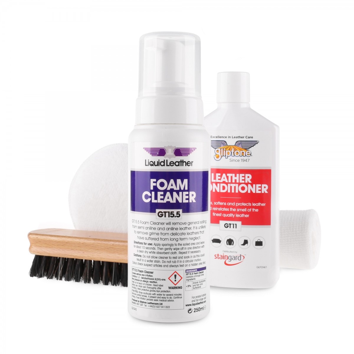 - Много нежен пянен почистващ препарат за кожа Gliptone Liquid Leather GT15.5 Foam Cleaner, който ще отстрани всички замърсявания и мазнини от кожата.