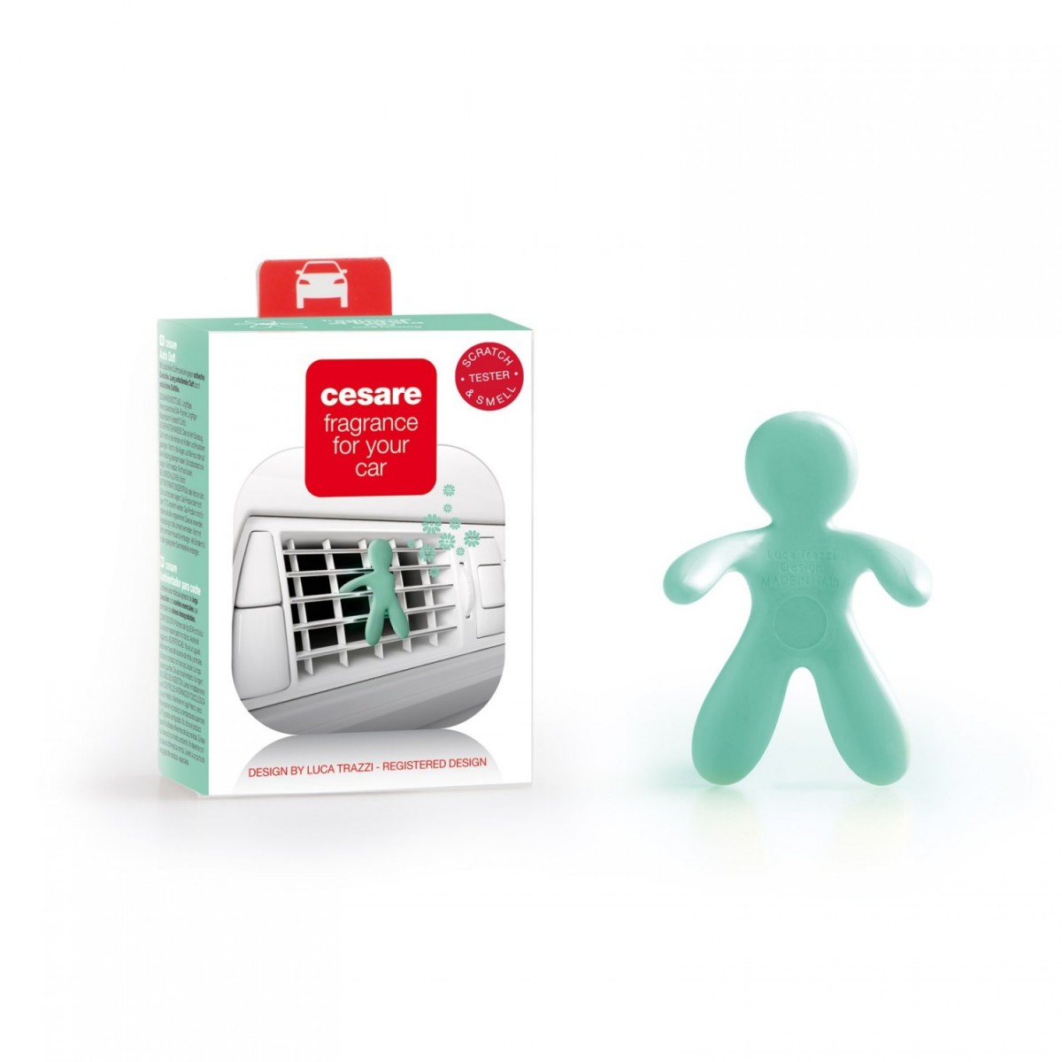 Cesare е освежител за въздух за автомобили, който съдържа активни молекули, които могат дълго да се борят с коварните бактерии, причиняващи неприятни миризми. Ароматът на кедрово и сандалово дърво е омекотен от листенца на теменужка и лавандула и подчертан с бергамот. Такъв е ароматът Sandal of Kerala (Santal z Kéraly). Фигурката Cesare от колекцията популярни фигурки Fresh Air Friends на Mr&Mrs Fragrance е идеален партньор за ароматизиране на интериора на вашия автомобил.Фигурка за вентилационната решетка Mr&Mrs Fragrance от серията CESARE