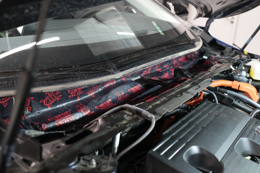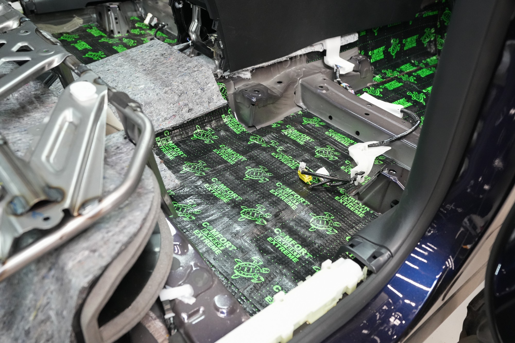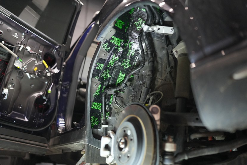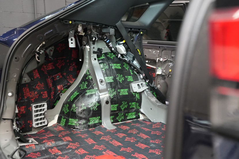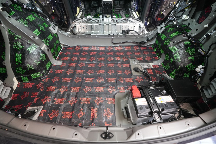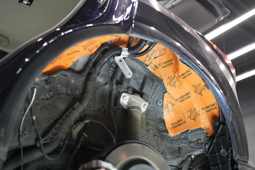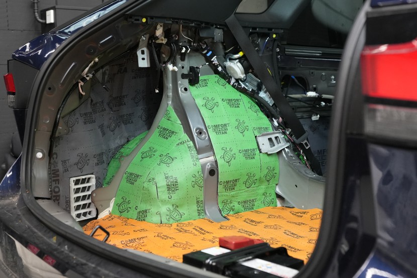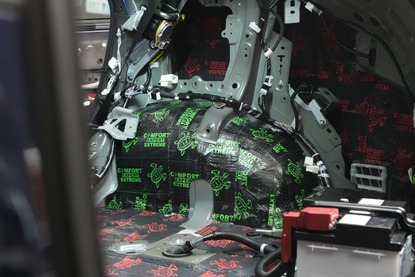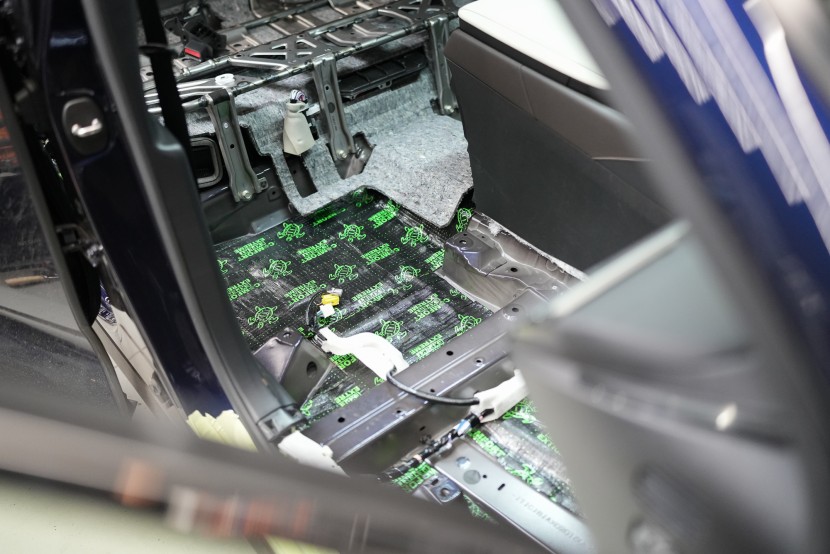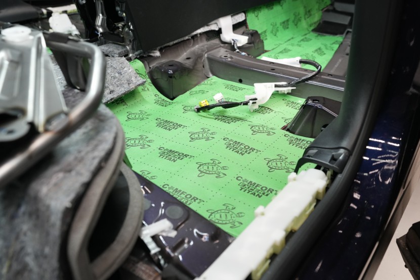 Собственикът на автомобила се реши на пълна шумоизолация в рамките на нашия пакет Expert Plus, който наскоро беше модернизиран. Ново използваме висококачествен звукоизолационен материал Comfortmat Titan, прилаган предимно на пода и арките – тоест части от каросерията, които са най-силно изложени на акустичното въздействие. Този материал може да намали шума с до 38 dB, което го поставя сред най-ефективните решения на пазара. Двуслойната конструкция, комбинираща материали от професионалната серия Expert, гарантира максимален акустичен ефект и дълготрайна издръжливост.