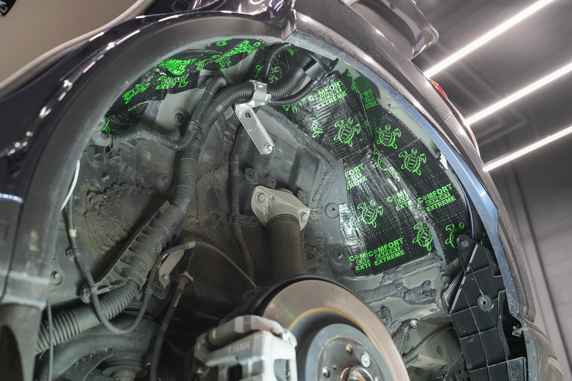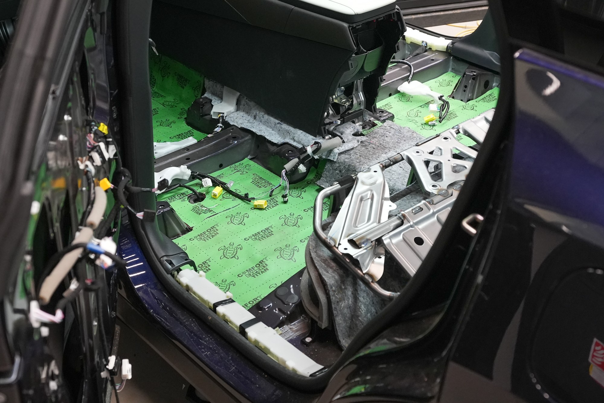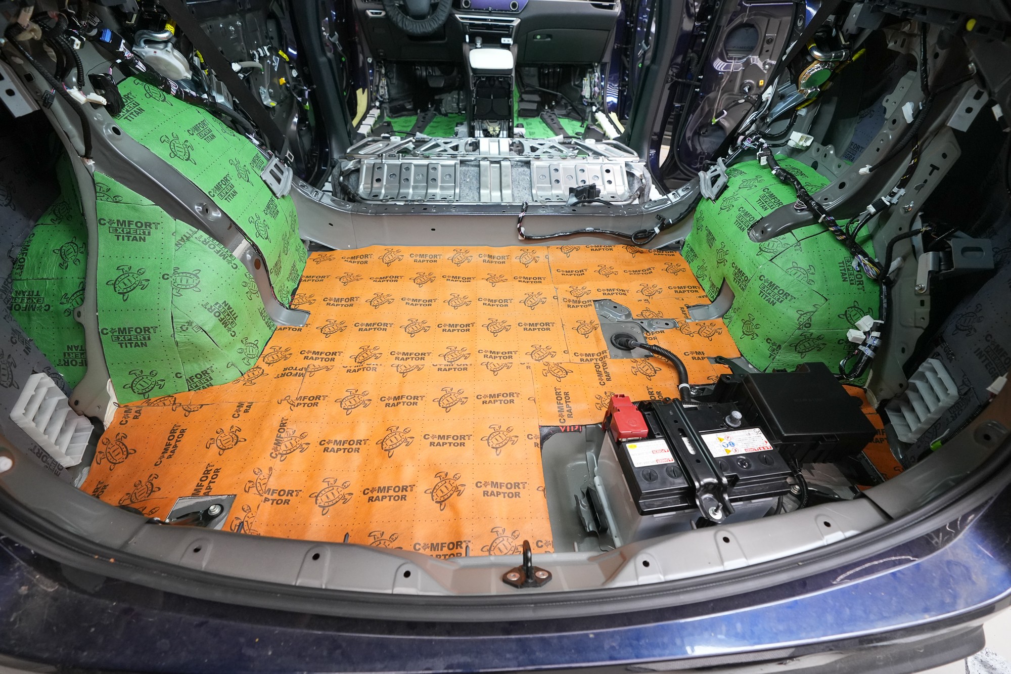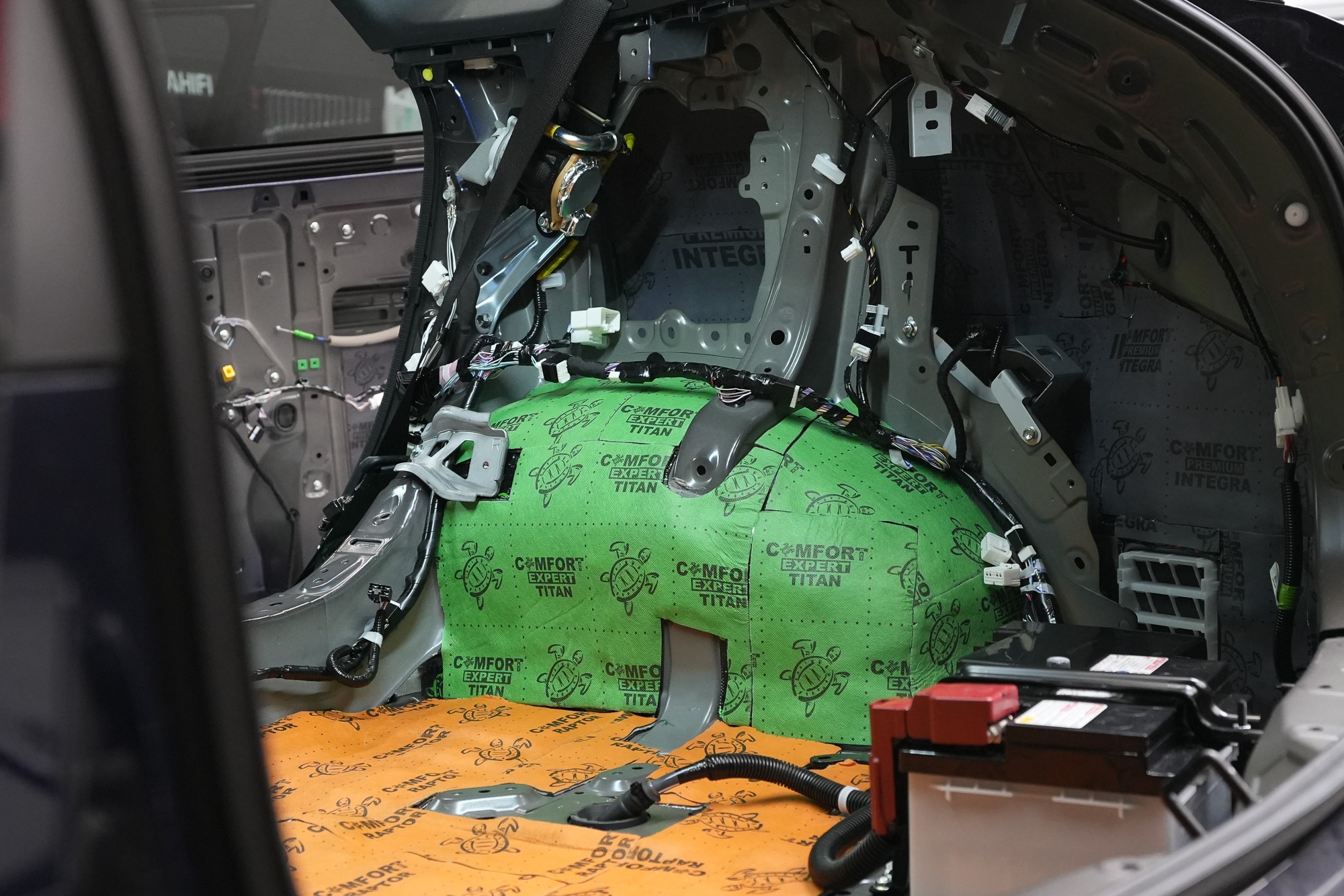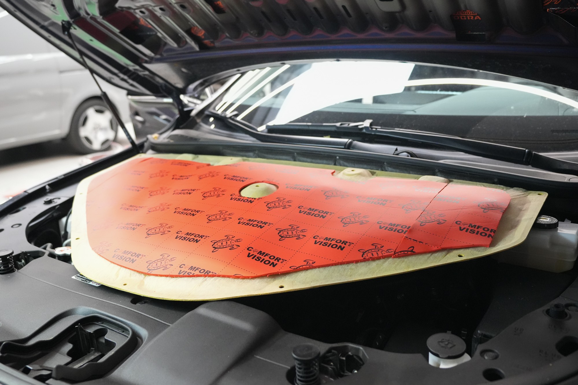 Собственикът на автомобила се реши на пълна шумоизолация в рамките на нашия пакет Expert Plus, който наскоро беше модернизиран. Ново използваме висококачествен звукоизолационен материал Comfortmat Titan, прилаган предимно на пода и арките – тоест части от каросерията, които са най-силно изложени на акустичното въздействие. Този материал може да намали шума с до 38 dB, което го поставя сред най-ефективните решения на пазара. Двуслойната конструкция, комбинираща материали от професионалната серия Expert, гарантира максимален акустичен ефект и дълготрайна издръжливост.