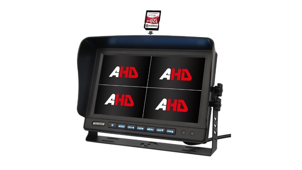 AHD LCD монитор 10,1\" със слънчев сенник, квадратор, запис от 4 камери на SD карта, подходящ например за автобуси или товарни автомобили.