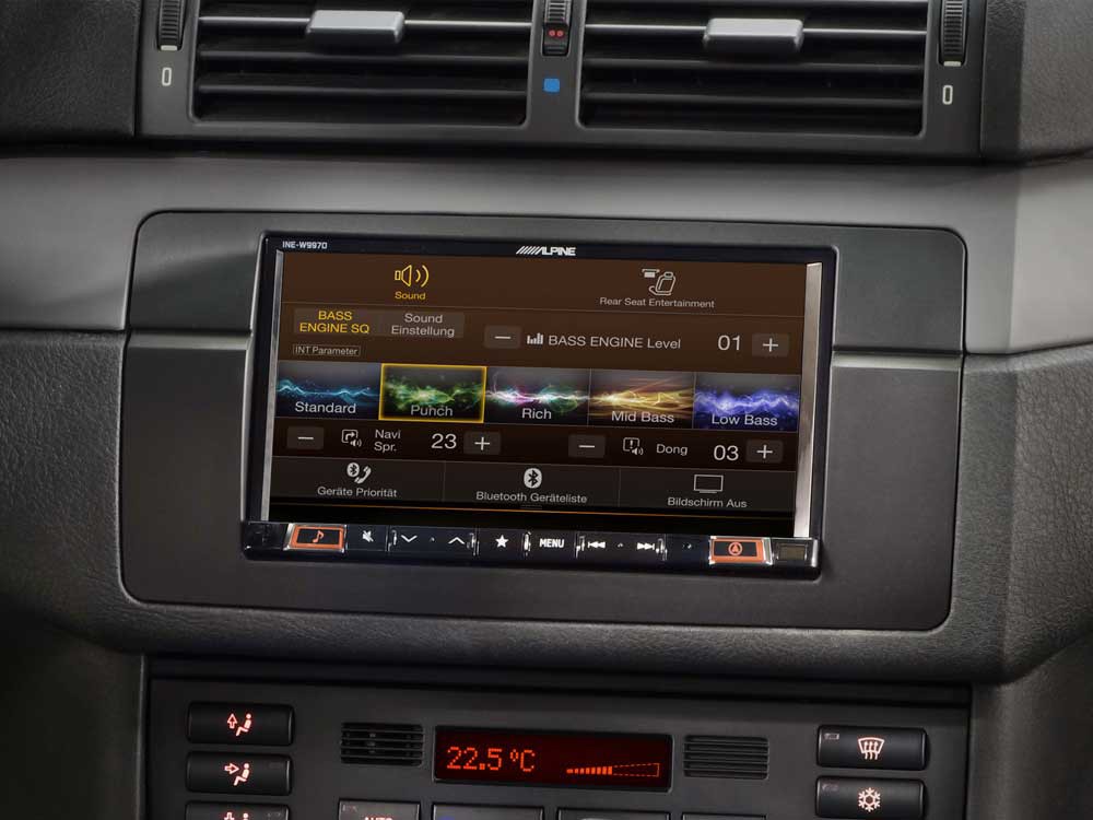 Alpine INE-W997E46 е безмеханична навигационна единица с 7" сензорен дисплей, DAB+ тунер, Bluetooth, HDMI вход, 3 чифта RCA изхода и DSP процесор.
