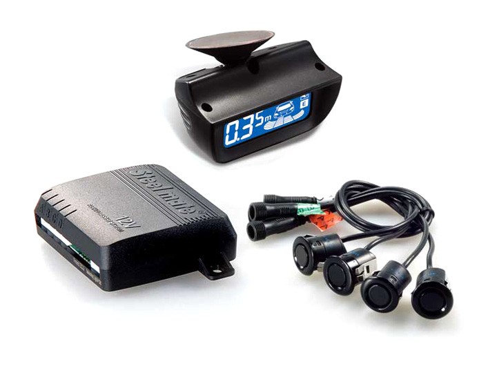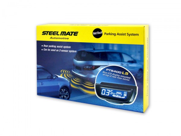 Parkovací asistent STEELMATE se 4 snímači a LCD displejem L5 umístitelným na spodní část zpětného zrcadla s akustickou signalizací určený pro instalaci do zadního nárazníku vozidla.