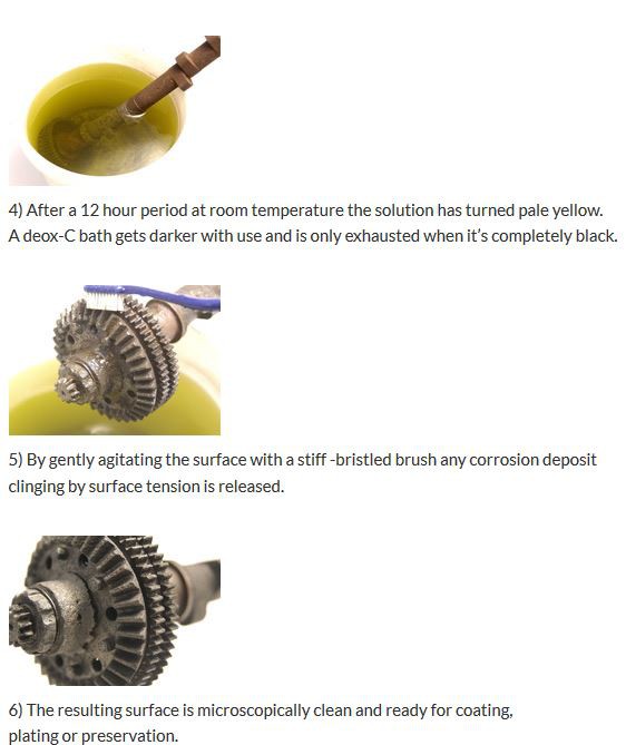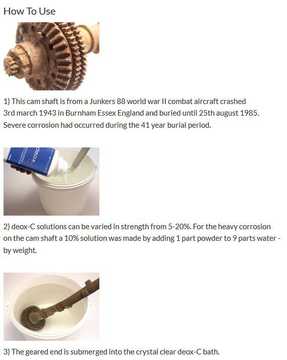 \n\nDeox-C е кристален, 100% активен продукт против корозия, предназначен за отстраняване на корозия от стомана, неръждаема стомана и повечето желязосъдържащи материали. Препаратът се разтваря във вода и създава вана с мощна течност за отстраняване на ръжда. Deox-C е изключително икономичен - например само 1 кг Deox-C създава до 20 литра силна вана за отстраняване на ръжда. Може да отстрани дори много тежка корозия, но е безопасен за употреба и върху най-деликатните предмети. Подходящ е за всички предмети, които могат да бъдат напълно потопени. Deox-C е безопасен, нетоксичен и биоразградим.