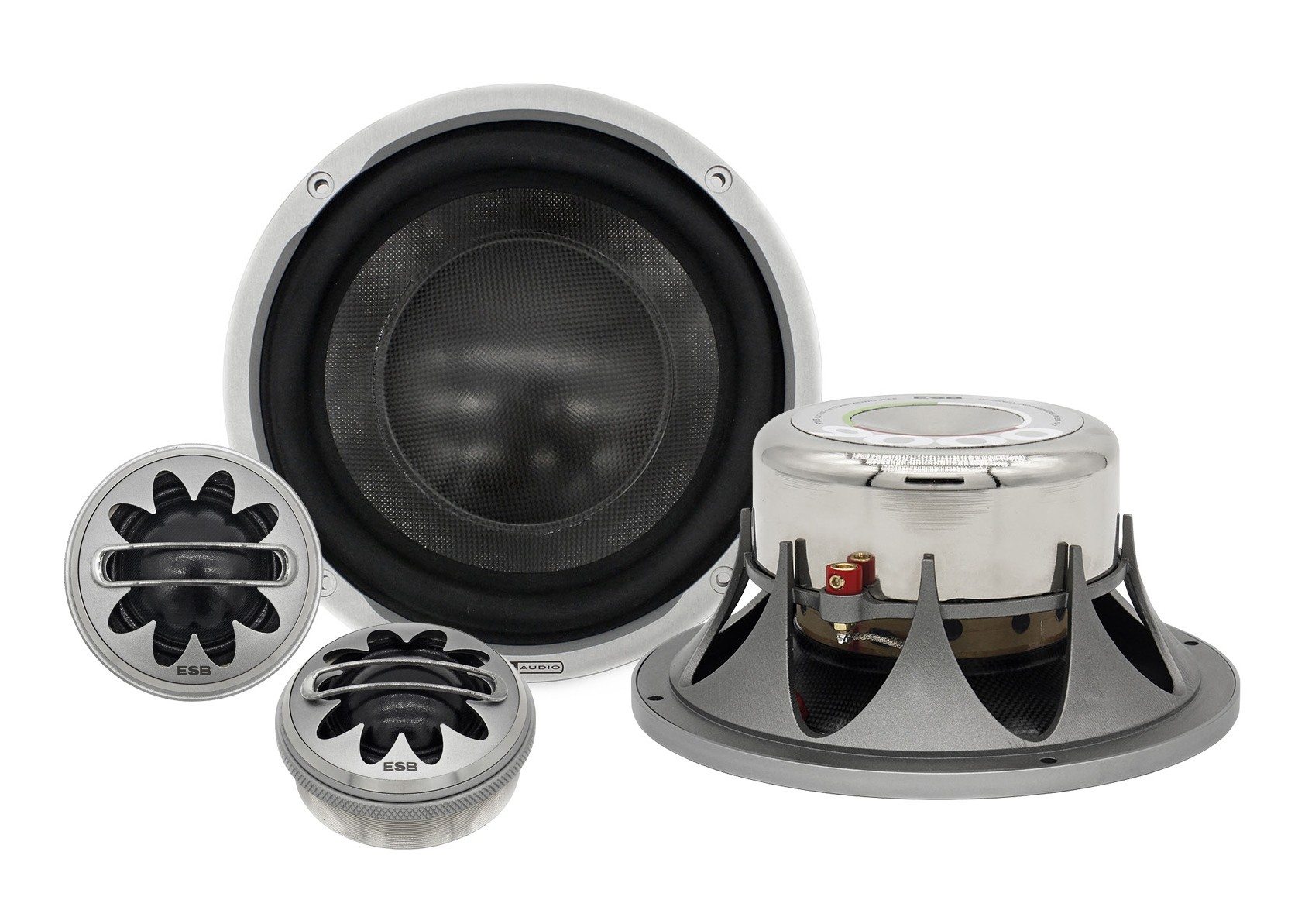 Тонколоните от серията ESB 9000 (Novemila) са сред технологично най-усъвършенстваните автомобилни говорители, които някога са били произвеждани. И също така сред най-елегантните! Технологията и дизайнът се съчетават в нова и нетипична естетика, благодарение на изключителната цветеобразна форма около мембраната на високочестотния говорител и също така върху рамките на басовите и средночестотните говорители. Този луксозен дизайн обаче не е създаден само от естетически съображения. Той е израз на иновация, която позволява акустичната пречупване по краищата на високочестотните говорители да бъде по-малко изразено и да се адаптира към дизайна на говорителите. Аналогията може да се намери в новите двигатели Rolls-Royce за най-съвременните самолети, които имат същата форма на задния ръб. Точно там въздухът излиза и се образуват основните турбуленции. С новата конструкция тези двигатели постигнаха големи преимущества, като намаляване на шума в кабината с 10 dB и едновременно намаляване на потреблението на гориво с 10 %. Това обаче не е просто случайно сходство. Конструкцията на high-end говорителите ESB и двигателите Rolls-Royce изхожда от същия принцип — да се намалят нежеланите акустични явления на ръбовете на говорителите, съответно на двигателите. ESB Audio 9.6K2 представлява референтен двулентов комплект, съставен от 165 mm басов говорител и 28 mm високочестотен говорител, който впечатлява не само с използваните технологии и дизайн, но преди всичко с абсолютно впечатляващия звук.