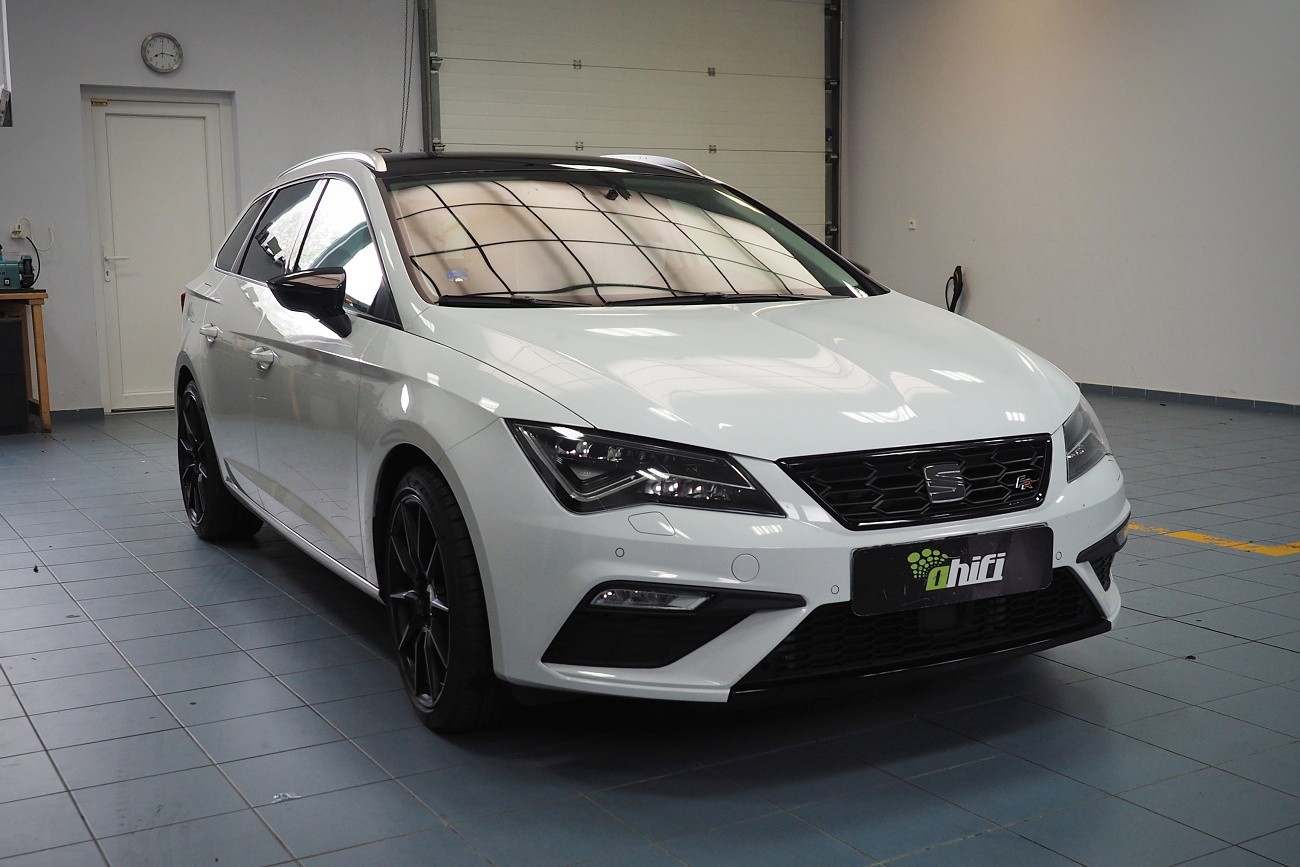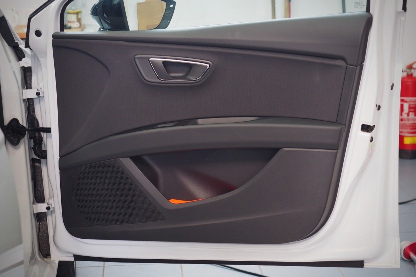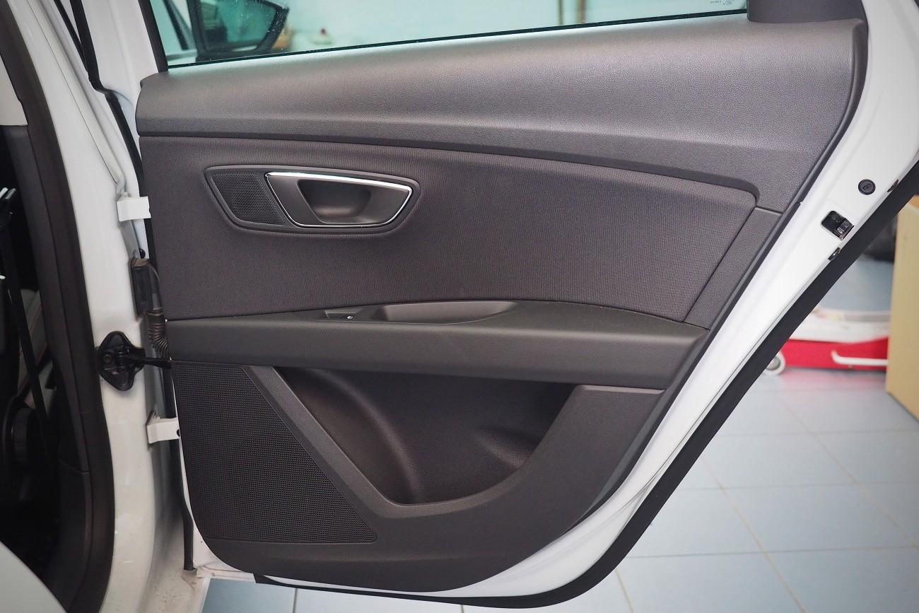 В автомобила Seat Leon трето поколение инсталирахме аудиосистема над стандартната, с италианските говорители Hertz от серията Cento, конкретно компонентите CK 165 и коаксиалите CX 165. Говорителите се отличават с много висока чувствителност, поради което са подходящи за свързване към фабричното авторадио, което може да им осигури достатъчна мощност. Освен качествен звук и детайлни, естествени високочестотни говорители, те имат и изразена басова компонента. Коаксиалните говорители, монтирани в задния плот, впечатляват с наклона на високочестотния говорител, което им позволява до известна степен да симулират компонентна конфигурация с отделен високоговорител. Повече информация за говорителите Hertz от серия Cento можете да прочетете в нашето ревю. За намаляване на шума от предните колела звукоизолирахме предните калници и също така инсталирахме бордова камера Neoline.