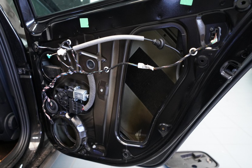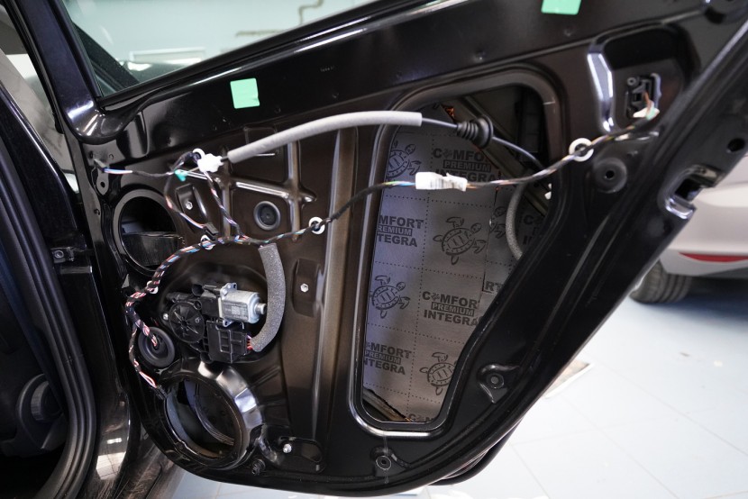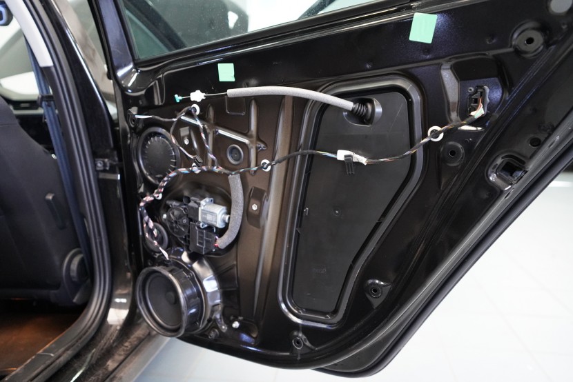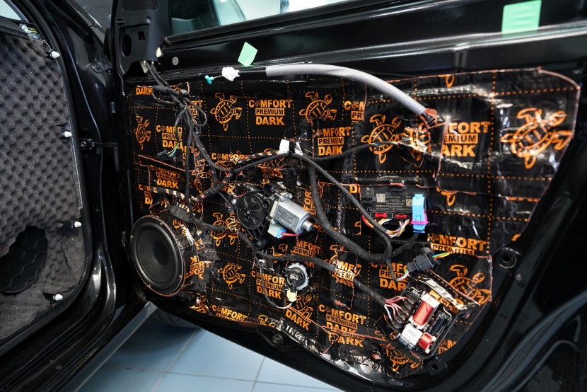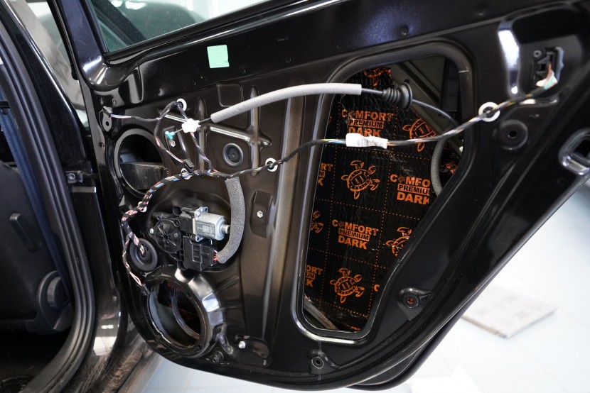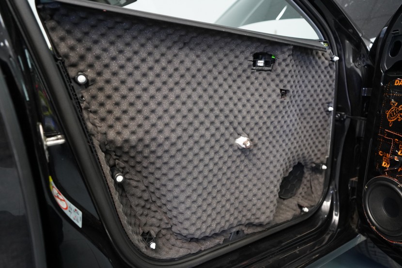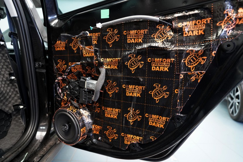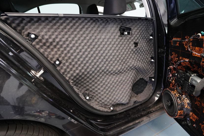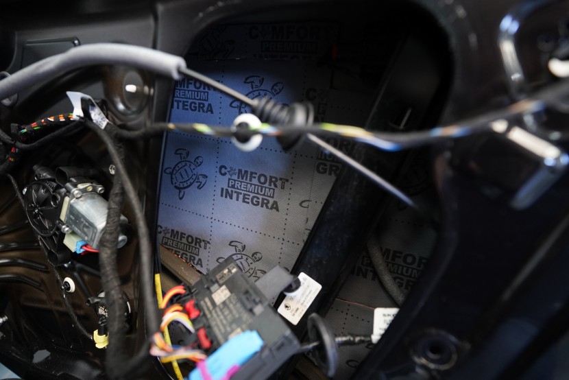Предните и задните врати шумоизолираме общо в 4 слоя, тъй като това е силно натоварена от вибрации и шум област. Първо на външния метал нанасяме премиум антивибрационния материал Comfortmat D2 и след това шумоизолационния материал Comfortmat Integra, предназначен специално за автомобилни врати. Този материал благодарение на уникалната си шумоизолационна мембрана има ненадмината способност да намали шума до -28 dB и освен това има и топлоизолационни свойства. Като следващ слой в този случай нанесохме акустичния материал Comfortmat Tsunami, който ще предотврати стоящи вълни зад среднобасовия говорител и по този начин ще подобри неговата акустика. След това отново нанесохме антивибрационния материал Comfortmat D2 на вътрешния метал на вратата. Последната стъпка е шумоизолацията на облицовката на вратите чрез гъвкавата формована пяна Comfortmat Soft Wave. Тя ще предотврати разпространението на шум в тази област и също така ще предотврати скърцане и дрънчене на пластмасите.
