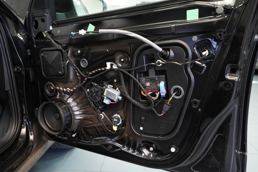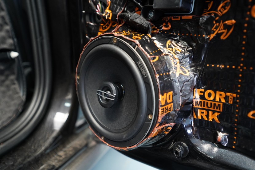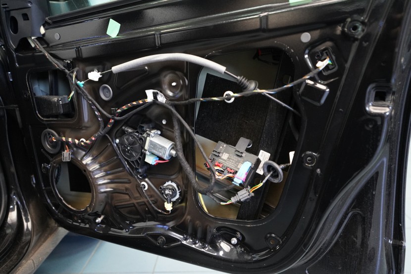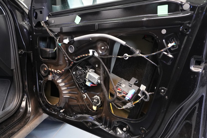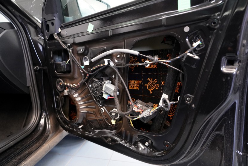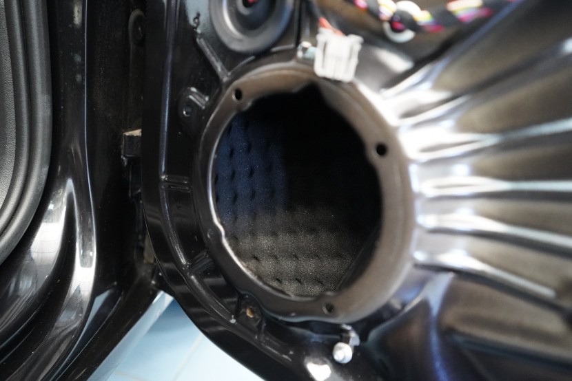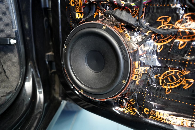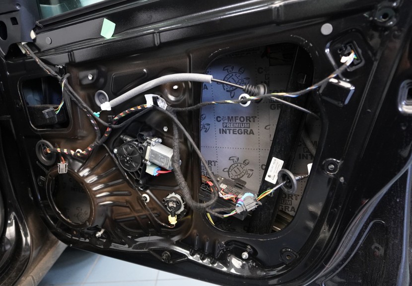Предните и задните врати шумоизолираме общо в 4 слоя, тъй като това е силно натоварена от вибрации и шум област. Първо на външния метал нанасяме премиум антивибрационния материал Comfortmat D2 и след това шумоизолационния материал Comfortmat Integra, предназначен специално за автомобилни врати. Този материал благодарение на уникалната си шумоизолационна мембрана има ненадмината способност да намали шума до -28 dB и освен това има и топлоизолационни свойства. Като следващ слой в този случай нанесохме акустичния материал Comfortmat Tsunami, който ще предотврати стоящи вълни зад среднобасовия говорител и по този начин ще подобри неговата акустика. След това отново нанесохме антивибрационния материал Comfortmat D2 на вътрешния метал на вратата. Последната стъпка е шумоизолацията на облицовката на вратите чрез гъвкавата формована пяна Comfortmat Soft Wave. Тя ще предотврати разпространението на шум в тази област и също така ще предотврати скърцане и дрънчене на пластмасите.