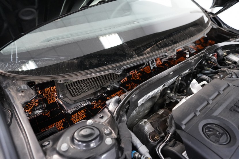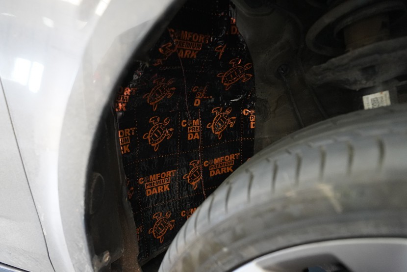 Последната област от шумоизолацията в рамките на пакета са предните калници. Металната част демпфираме с дебелия антивибрационен материал Comfortmat D4 с дебелина 4 mm и висок ILC, а пластмасовите калници отново в три слоя с материал Comfortmat Blockshot. Въпреки че това е базов пакет за шумоизолация, благодарение на правилния избор на области за шумоизолация и първокласните мембранни материали, използвани на вратите и калниците, успяхме значително да намалим шума, проникващ в интериора на автомобила.
