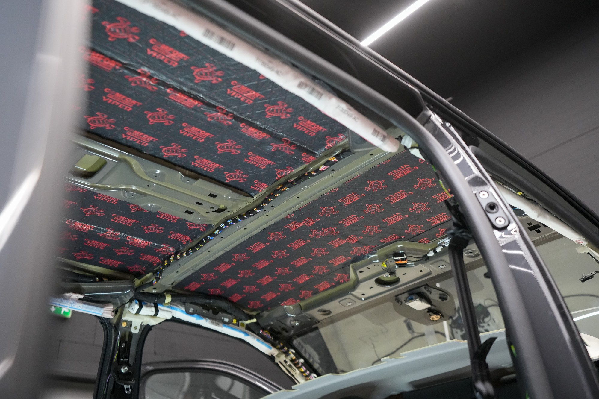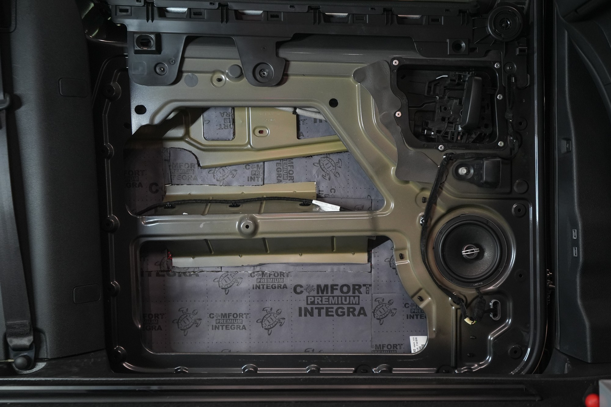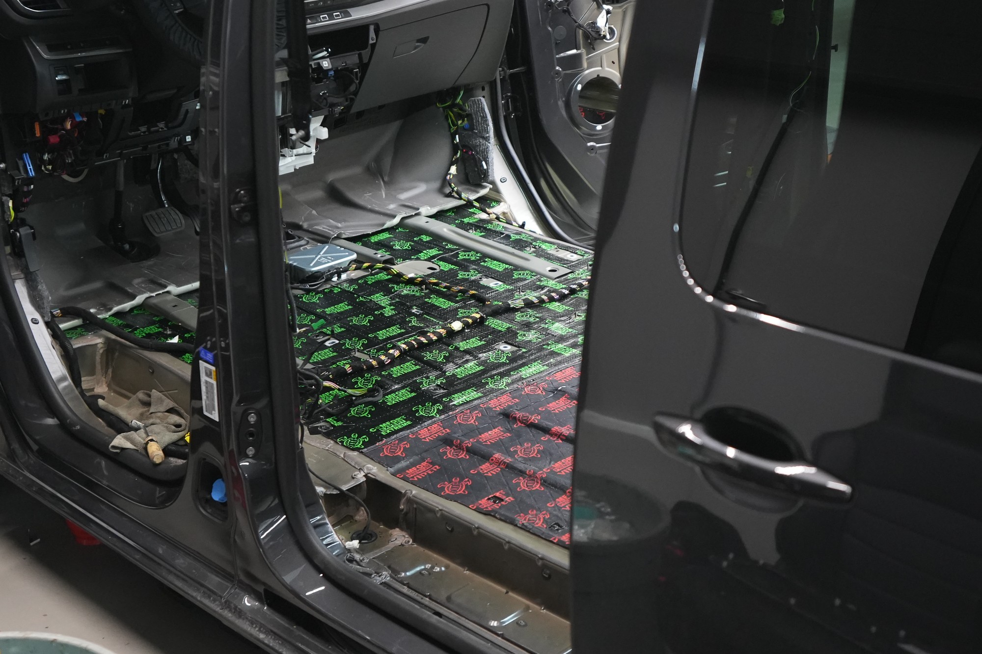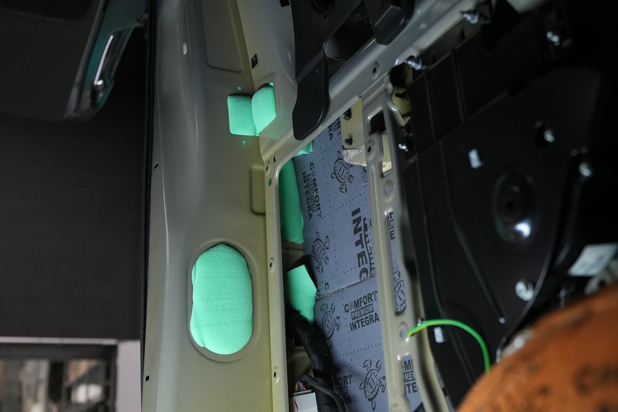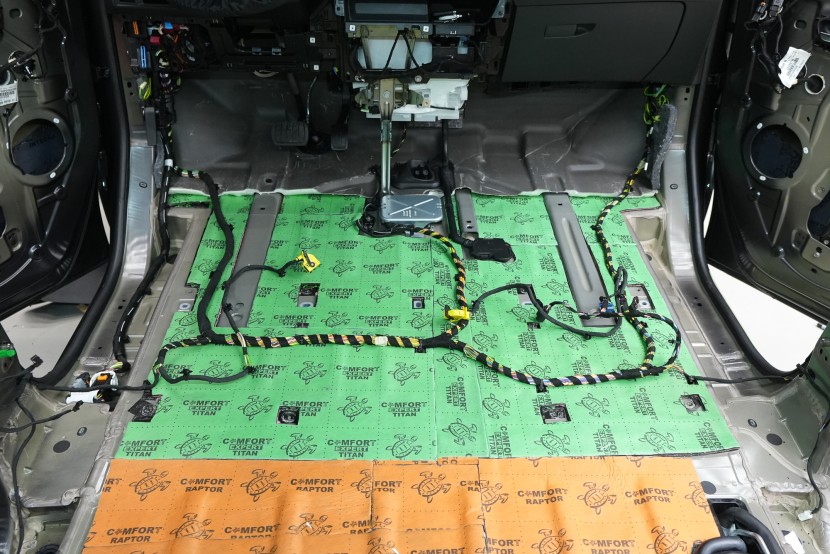 Собственикът на автомобила се реши на пълна шумоизолация в рамките на нашия пакет Expert Plus, който наскоро беше модернизиран. Ново във внедряването е използването на водещия звукоизолационен материал Comfortmat Titan, приложен предимно върху пода и арките на колелата – т.е. части от каросерията, които са най-силно подложени на шумово натоварване. Този материал може да намали шума до 38 dB, което го поставя сред най-ефективните решения днес. Двуслойната конструкция, комбинираща материали от професионалната серия Expert, гарантира максимален акустичен ефект и дългосрочна издръжливост.