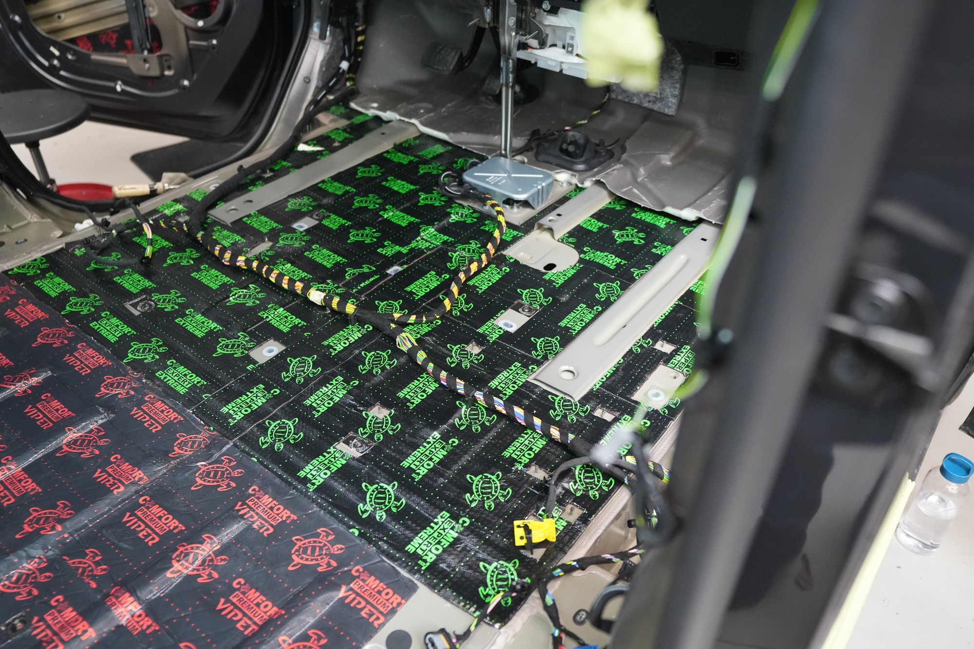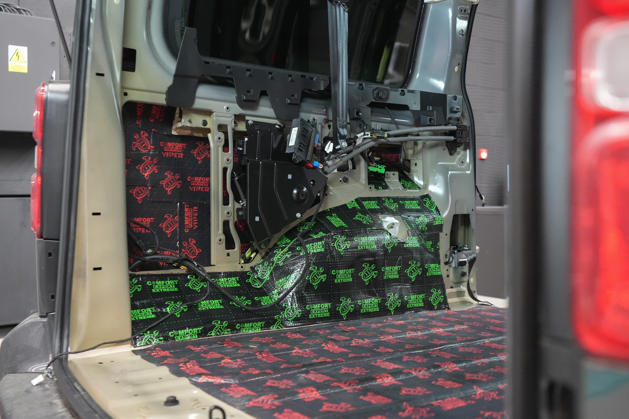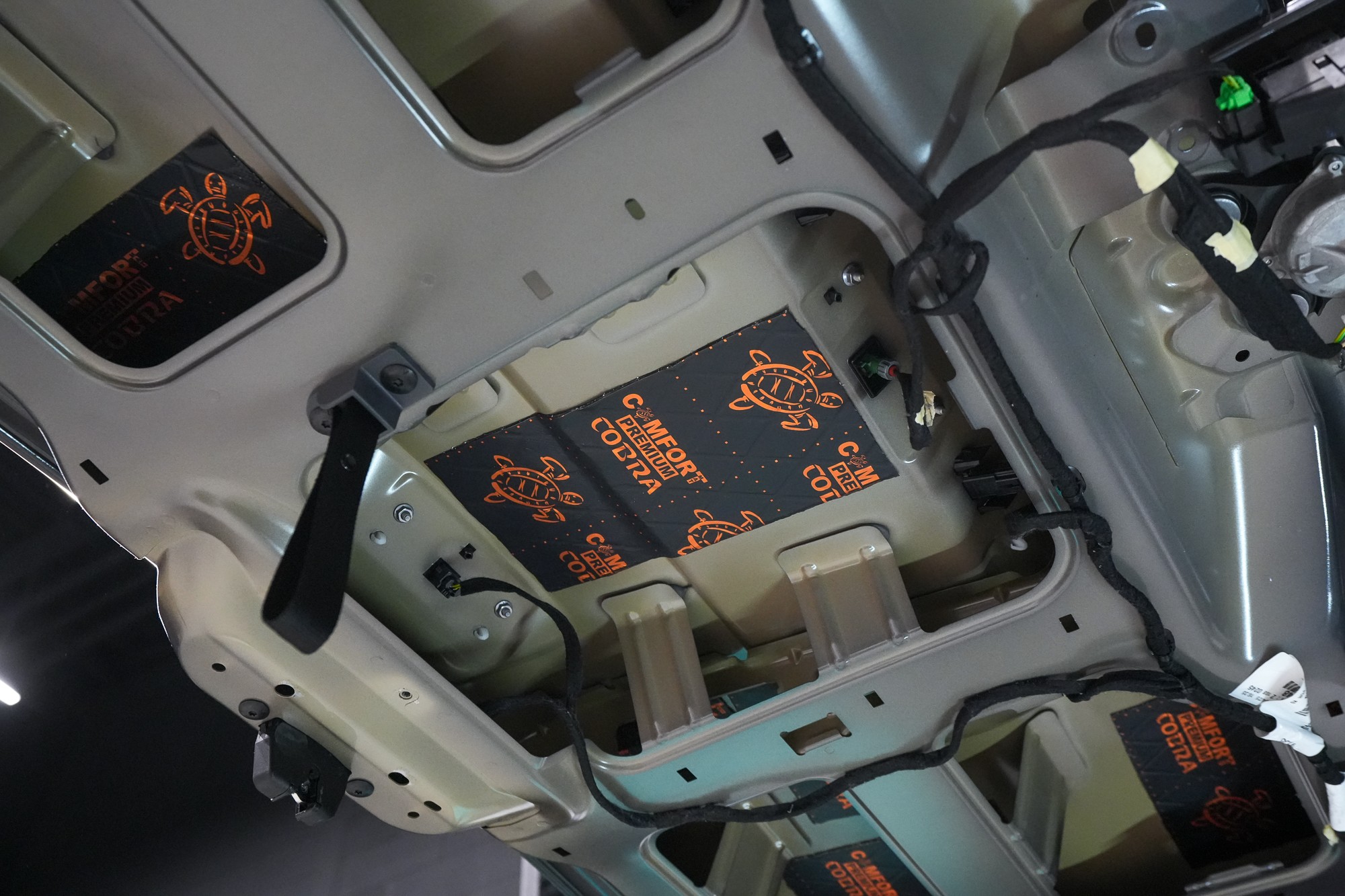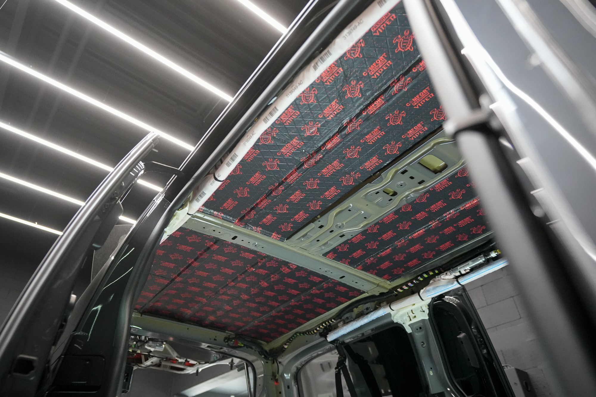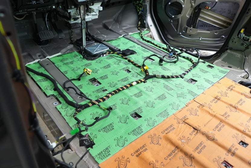 Собственикът на автомобила се реши на пълна шумоизолация в рамките на нашия пакет Expert Plus, който наскоро беше модернизиран. Ново във внедряването е използването на водещия звукоизолационен материал Comfortmat Titan, приложен предимно върху пода и арките на колелата – т.е. части от каросерията, които са най-силно подложени на шумово натоварване. Този материал може да намали шума до 38 dB, което го поставя сред най-ефективните решения днес. Двуслойната конструкция, комбинираща материали от професионалната серия Expert, гарантира максимален акустичен ефект и дългосрочна издръжливост.