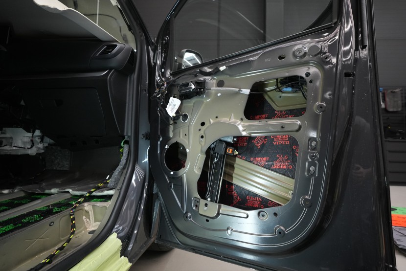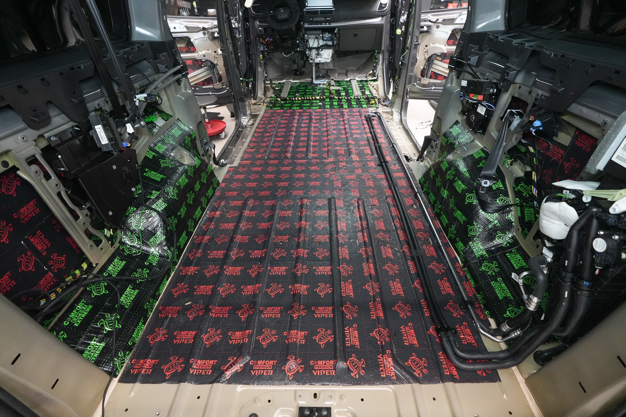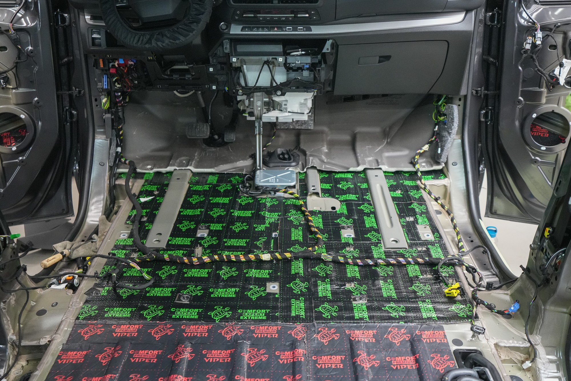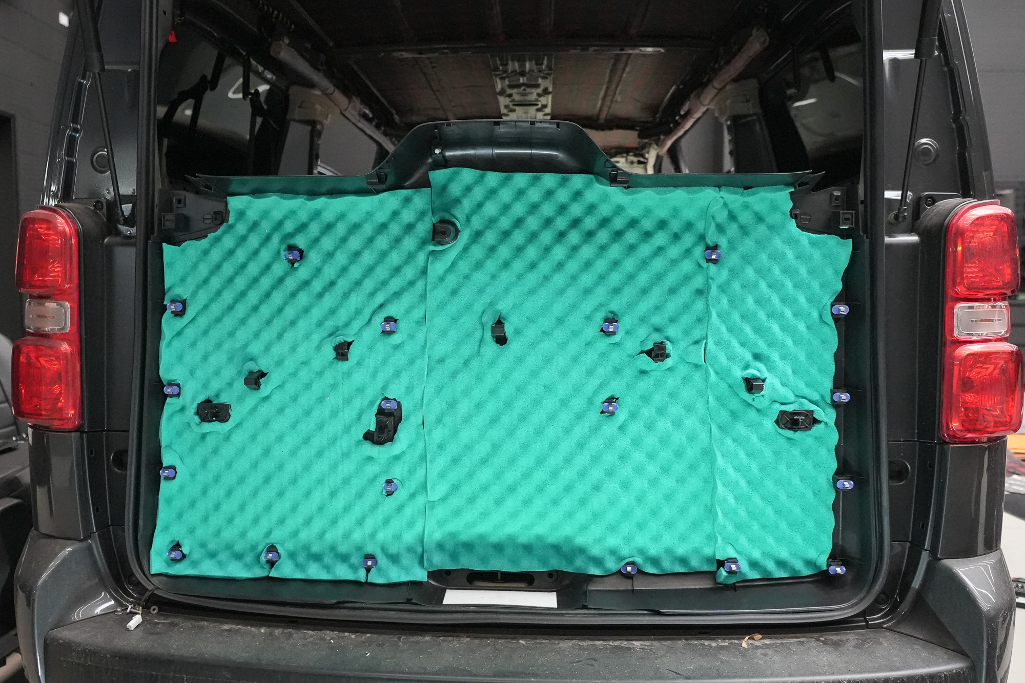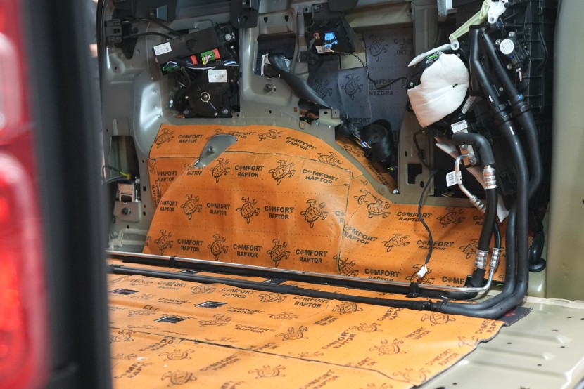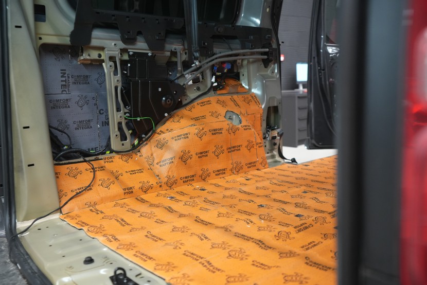 Собственикът на автомобила се реши на пълна шумоизолация в рамките на нашия пакет Expert Plus, който наскоро беше модернизиран. Ново във внедряването е използването на водещия звукоизолационен материал Comfortmat Titan, приложен предимно върху пода и арките на колелата – т.е. части от каросерията, които са най-силно подложени на шумово натоварване. Този материал може да намали шума до 38 dB, което го поставя сред най-ефективните решения днес. Двуслойната конструкция, комбинираща материали от професионалната серия Expert, гарантира максимален акустичен ефект и дългосрочна издръжливост.