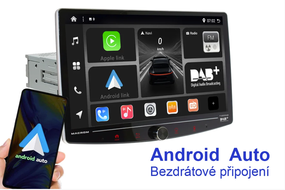 MACROM T1003DAB je špičková multimediální stanice do auta, která promění váš vůz v moderní infotainment centrum. Elegantní 10″ QLED displej s Full HD rozlišením (1920 × 1080) je otočný a výškově nastavitelný, takže si snadno přizpůsobíte úhel pohledu. Díky výkonnému 8jádrovému procesoru a systému Android 13 běží zařízení rychle a plynule. Podporuje bezdrátové Apple CarPlay a Android Auto, online navigaci, Bluetooth handsfree i hudební streaming. Vestavěný DSP procesor se 64pásmovým EQ zajistí perfektní zvuk, zatímco krátký start do 2 sekund přináší okamžité použití.