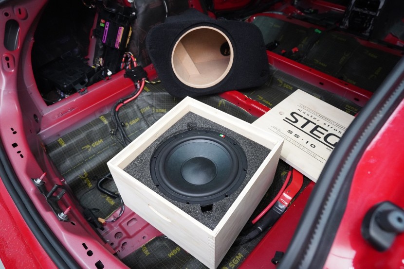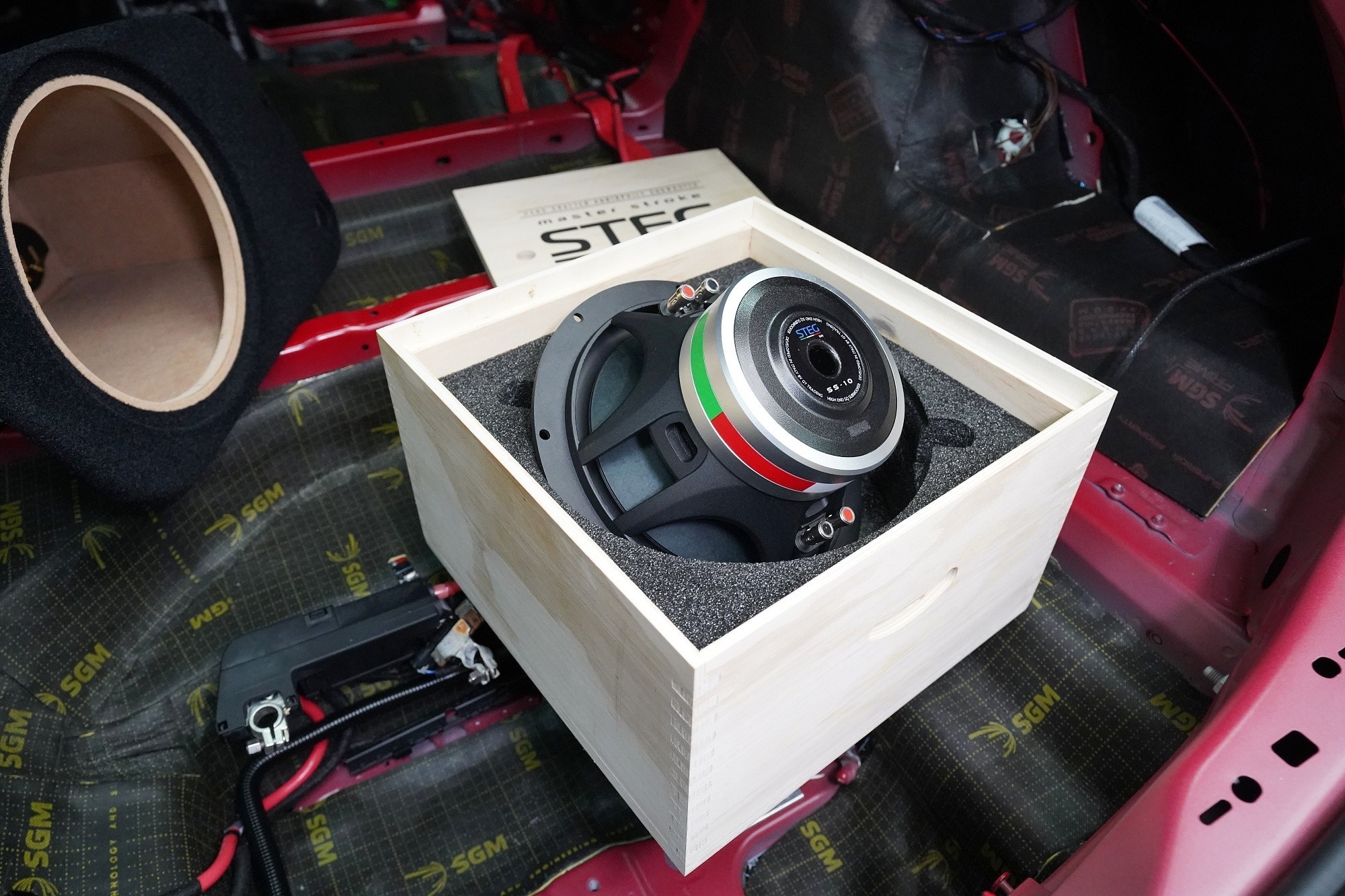 Náročným výběrem prošel i subwoofer, kde byl požadavek na maximální kvalitu a přitom nutnost instalace v malé ozvučnici v bočnici kufru. Snad jen jeden subwoofer nakonec všem požadavkům vyhovoval a to audiofilní subwoofer z nejvyšší modelové řady Master Stroke od italského výrobce Steg. Ve Stegu směle prohlašují, že se jedná o nejkvalitnější subwoofer, jaký kdy vyrobili a my jim dáváme za pravdu, tak přesné a věrné spodní tóny je radost poslouchat. Excelentní.
