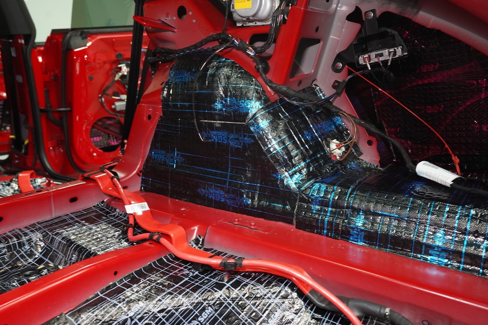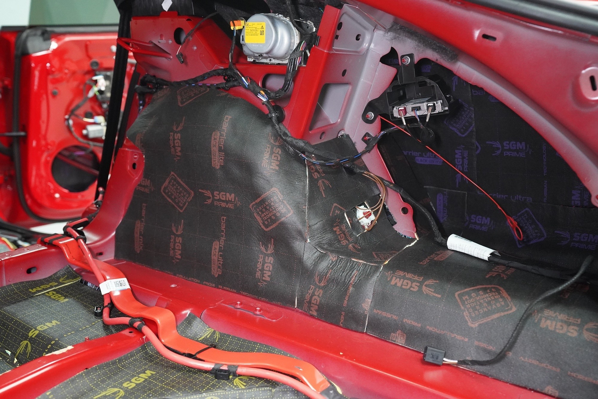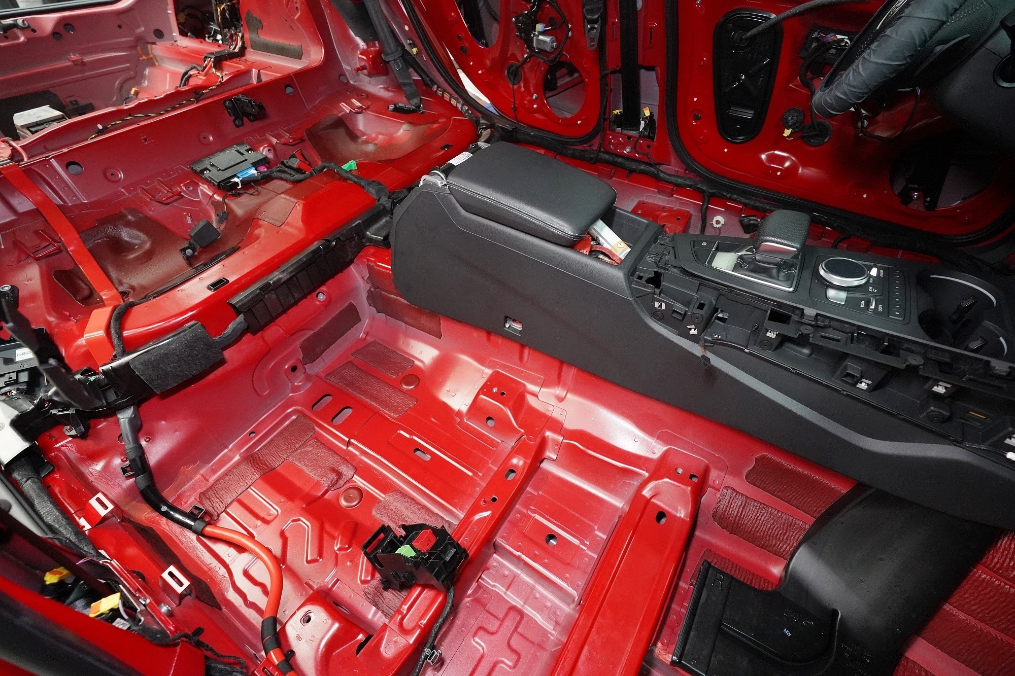 Dual Prime aplikujeme na všechny přístupné oblasti, abychom umožnili absorpci maximálního množství vibrací a nízkofrekvenčního hluku. V přední části podlahy se dostáváme až pod palubní desku, díky čemuž důkladně odhlučníme i přední podběhy z vnitřní části vozu, kde je přístup k větší ploše karoserie. Podlahu odhlučňujeme vysoce účinným antivibračním materiálem o tloušťce 4 mm a zvukově izolačním membránovým materiálem v druhé vrstvě o tloušťce 6 mm. Celkem tedy 10 mm zvukové izolace, což má za následek důkladné zamezení hluku od předních pneumatik i bez aplikace z vnější strany.