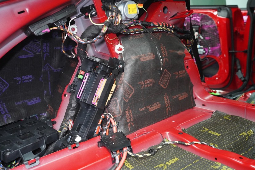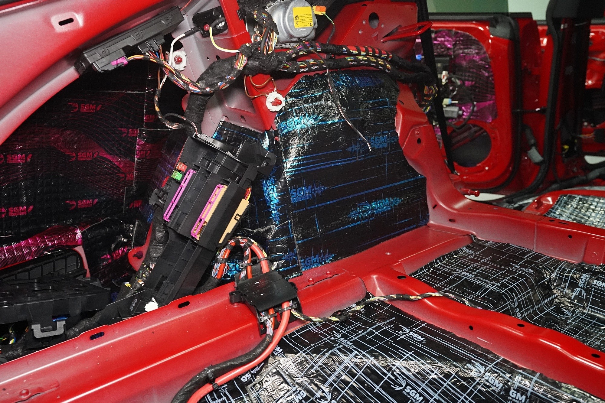 Podobným způsobem odhlučňujeme zavazadlový prostor, což je vzhledem k množství elektroniky časově i technicky náročné. I dno kufru je velmi zatěžováno vibracemi a hlukem a musíme tedy postupovat s velkou pečlivostí. Na dno kufru aplikujeme stejný materiál jako pod zadní sedačky, tedy SGM Onyx 3 o tloušťce 3 mm. Ten nejen absorbuje veškeré vibrace, ale pohltí i nízkofrekvenční hluk.