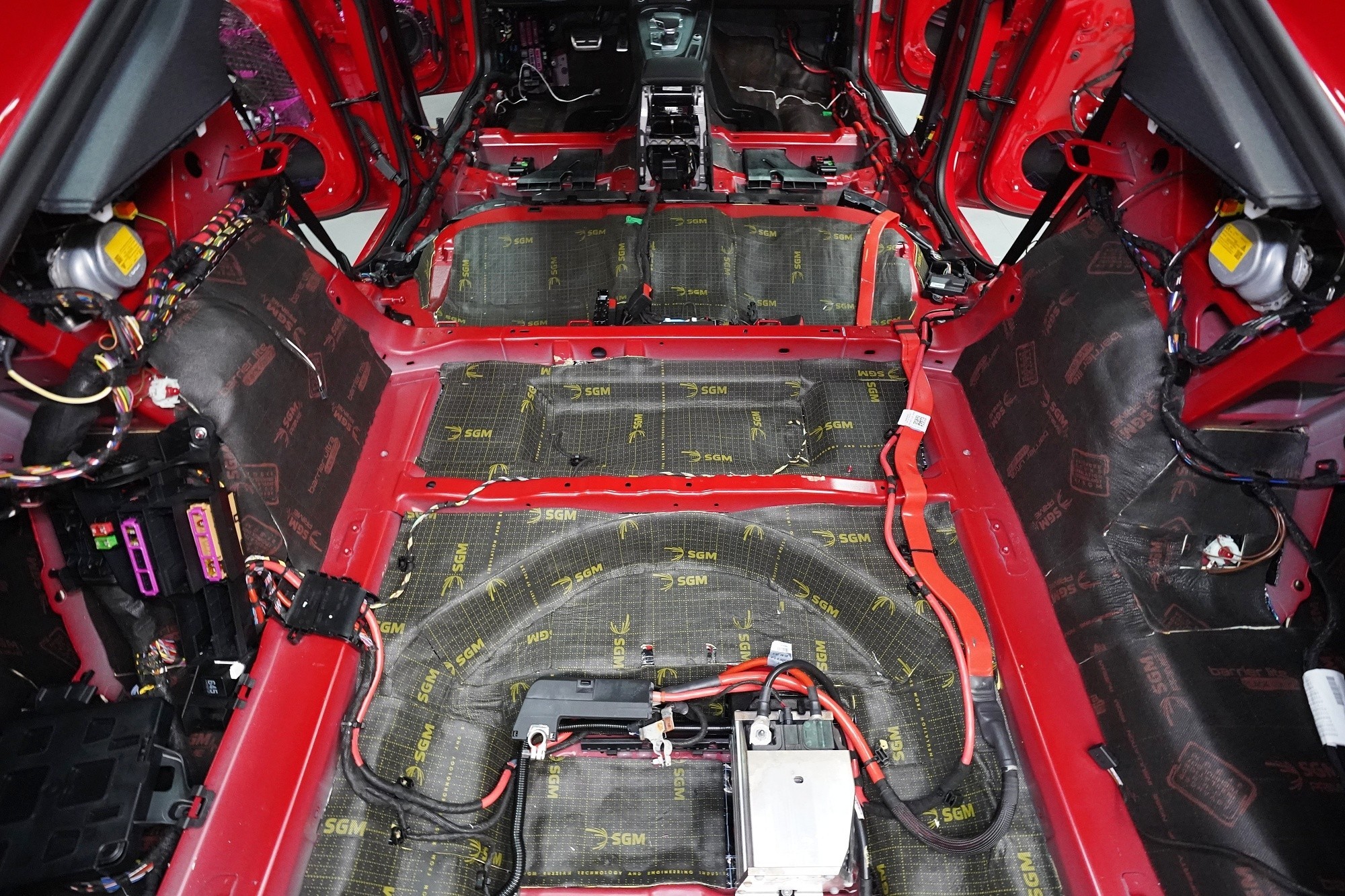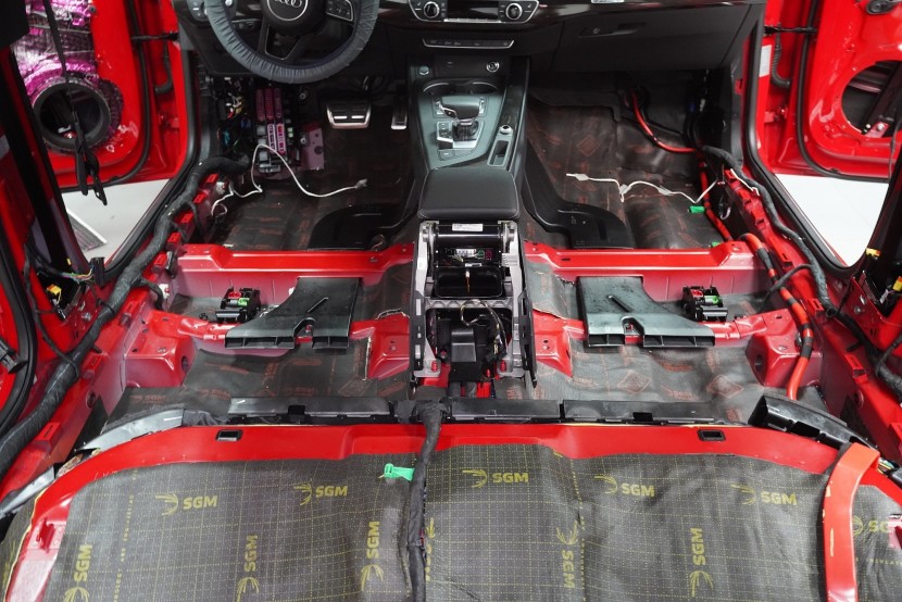 Podlaha je extrémně náchylná nejen na hluk, ale vzhledem k velké ploše i na výrazné vibrace od odrážejícího se hluku vozovky, od motoru, převodovky, pneumatik i výfukového systému. U balíčku Premium Plus volíme v první vrstvě jeden z nejúčinnějších materiálů na trhu o tloušťce 4 mm, konkrétně SGM Dual Prime s rekordním akustickým ztrátovým činitelem (MLF) o hodnotě 0,66 jednotek. Antivibrační materiál s těmito vlastnostmi dokáže účinně zamezit šíření vibrací a nízkofrekvenčního hluku a díky své flexibilitě jej není nutné nahřívat. Na prostor pod zadními sedačkami aplikujeme tenčí antivibrační materiál SGM Onyx 3 o tloušťce 3 mm a taktéž s velmi vysokým MLF o hodnotě 0,47 jednotek.