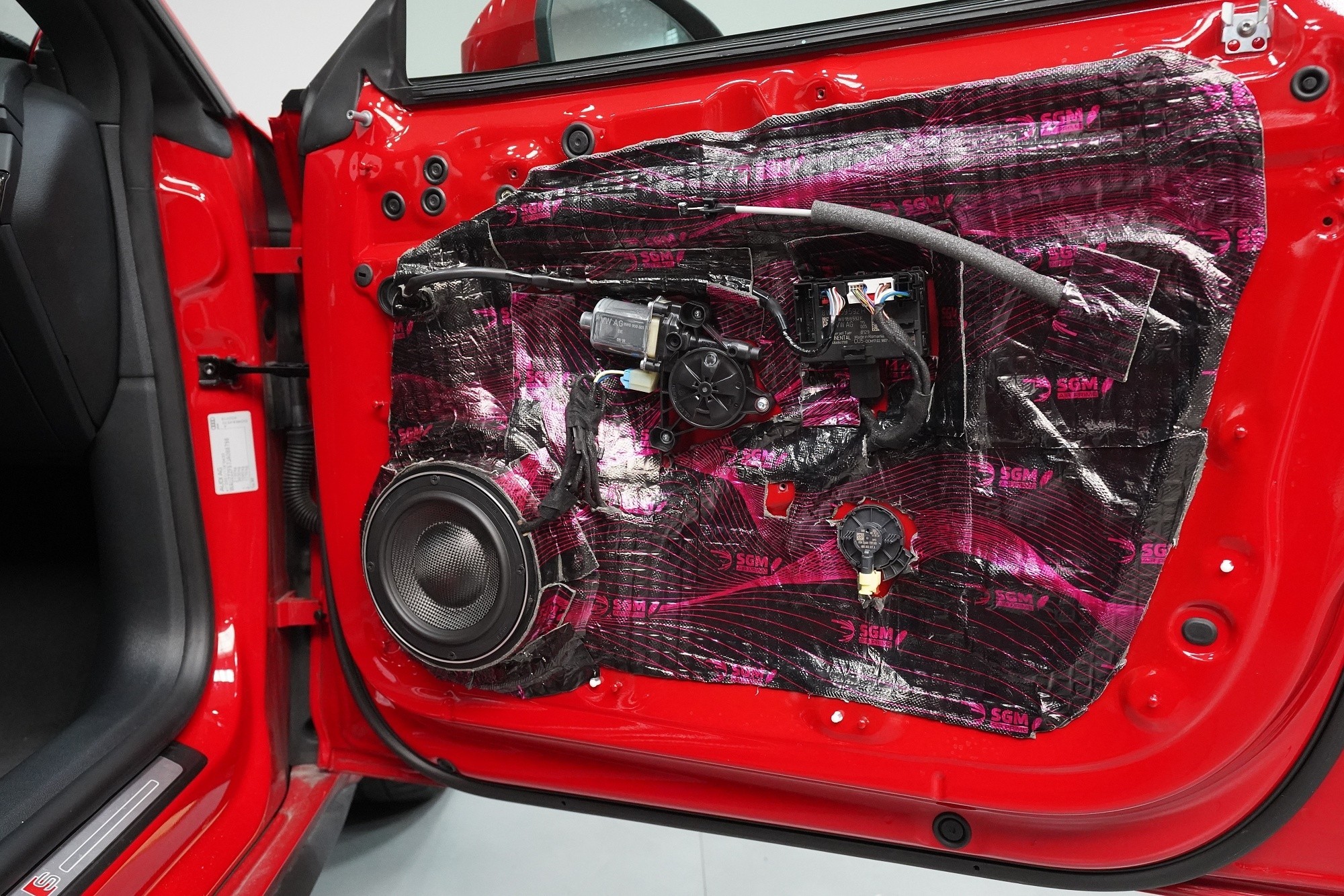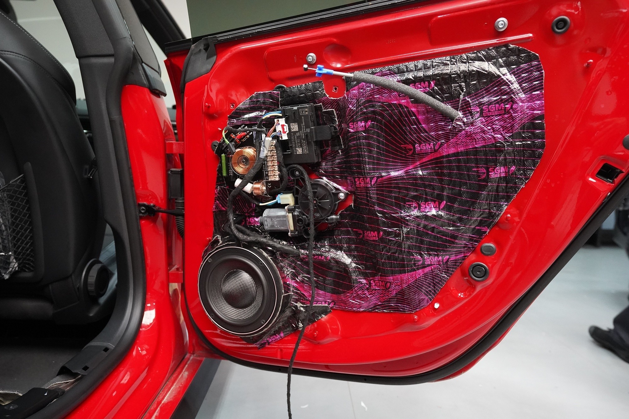 Třetí vrstvou je taktéž odlehčený antivibrační materiál SGM modelové řady Air, tentokrát však ve variantě 2 mm pro co nejnižší zatížení dveří. Tato vrstva slouží k zamezení vibrací a rezonancí vnitřního plechu dveří a u většiny vozidel i k vytvoření ozvučnice pro reproduktory, což má za následek zlepšení ozvučení. A to samozřejmě platí i u nově instalovaných reproduktorů Morel, u kterých je tlumení dveří prakticky nezbytné.