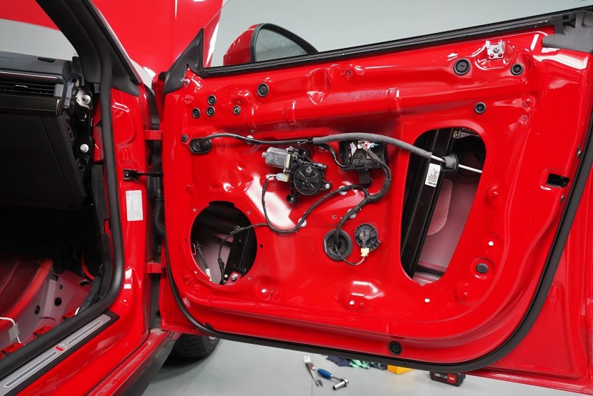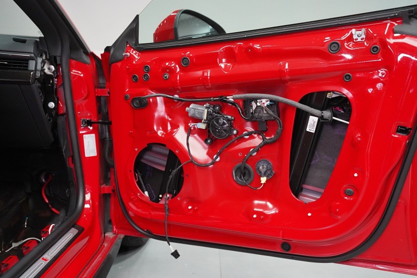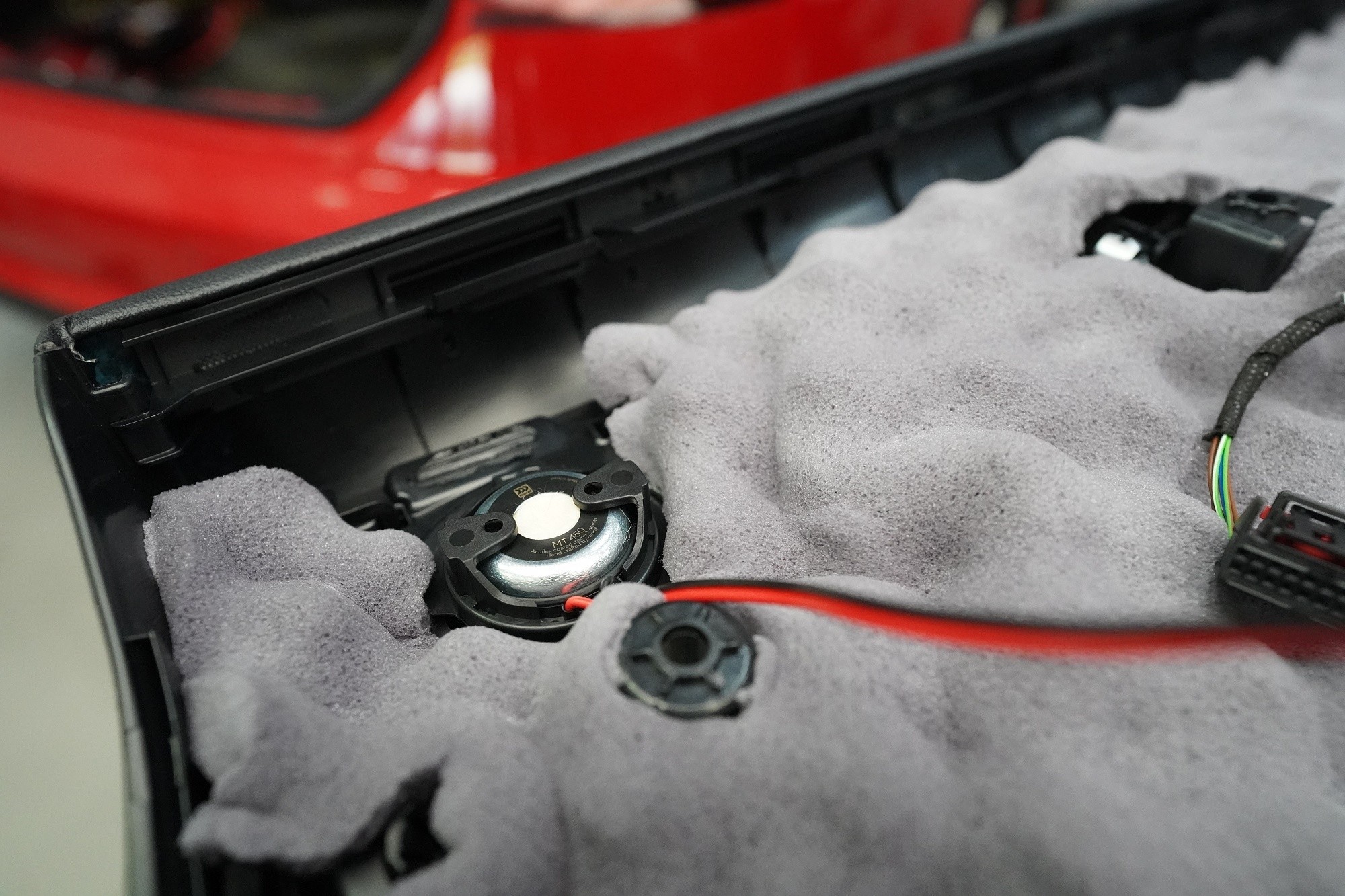 Na fotografii již vidíte přední dveře s osazeným středobasovým reproduktorem Morel Elate Carbon. Je téměř škoda, že nádherná karbonová membrána bude nakonec skryta dveřní výplní.