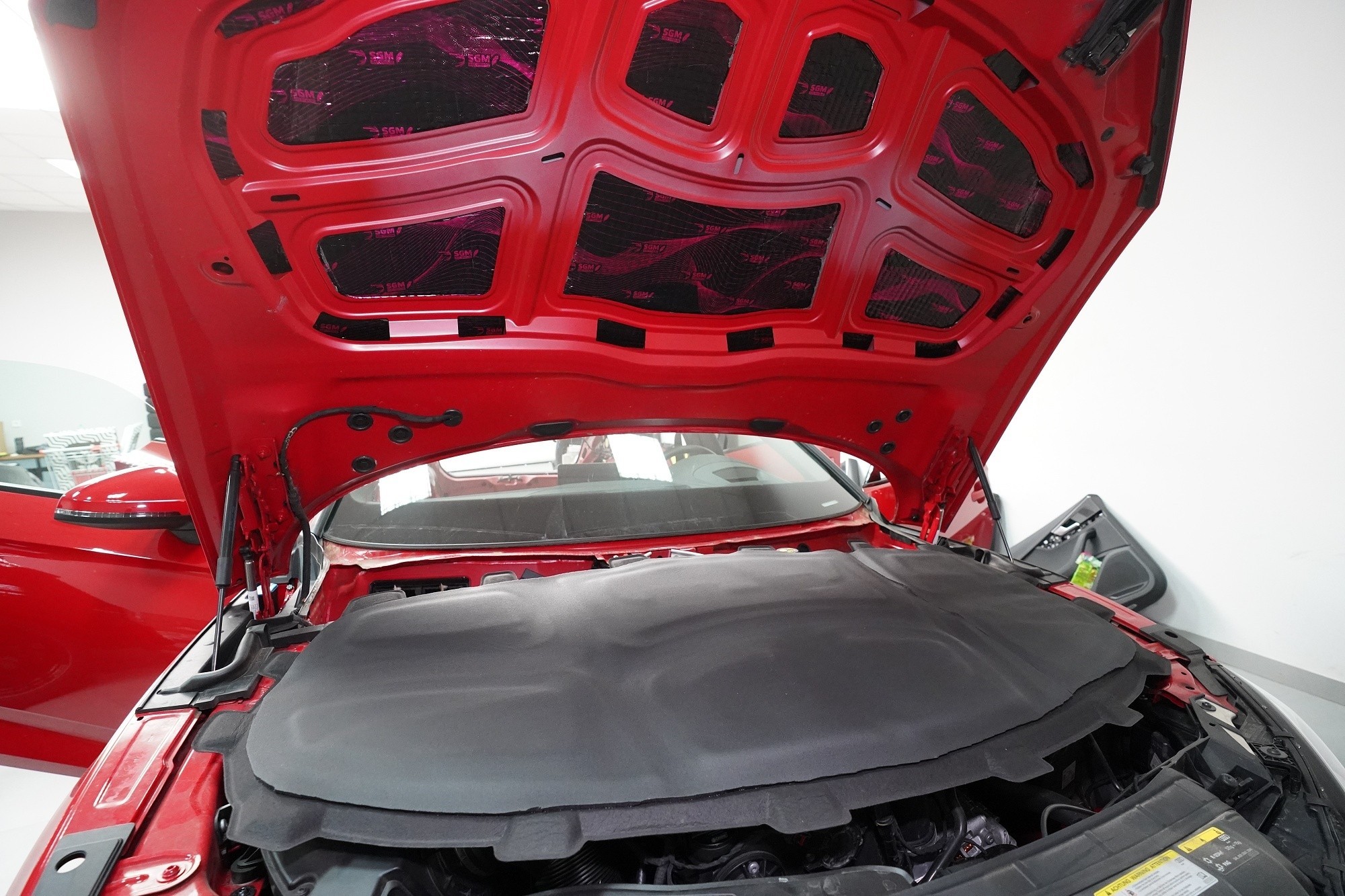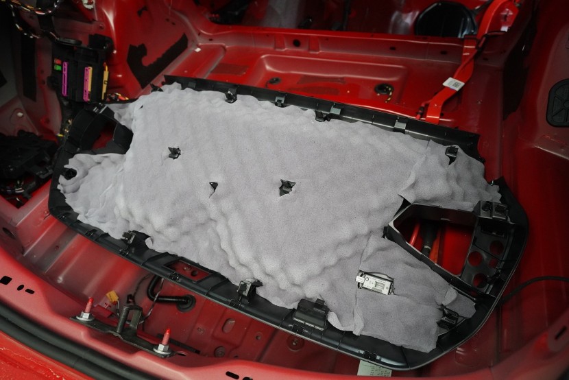Nezapomínáme ani na kapotu, na kterou v první vrstvě aplikujeme lehký antivibrační materiál SGM Air 2. Tím kapotu zpevníme, zamezíme vibracím, které se přenáší do dalších částí vozu a zmizí i typický plechový zvuk při zavření kapoty. Na originální kryt kapoty následně aplikujeme zvukově i tepelně izolační materiál SGM R-Ton, který sníží hluk motoru a to při zachování původního vzhledu motorového prostoru