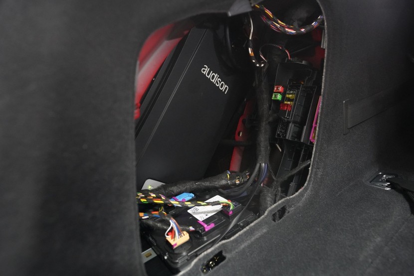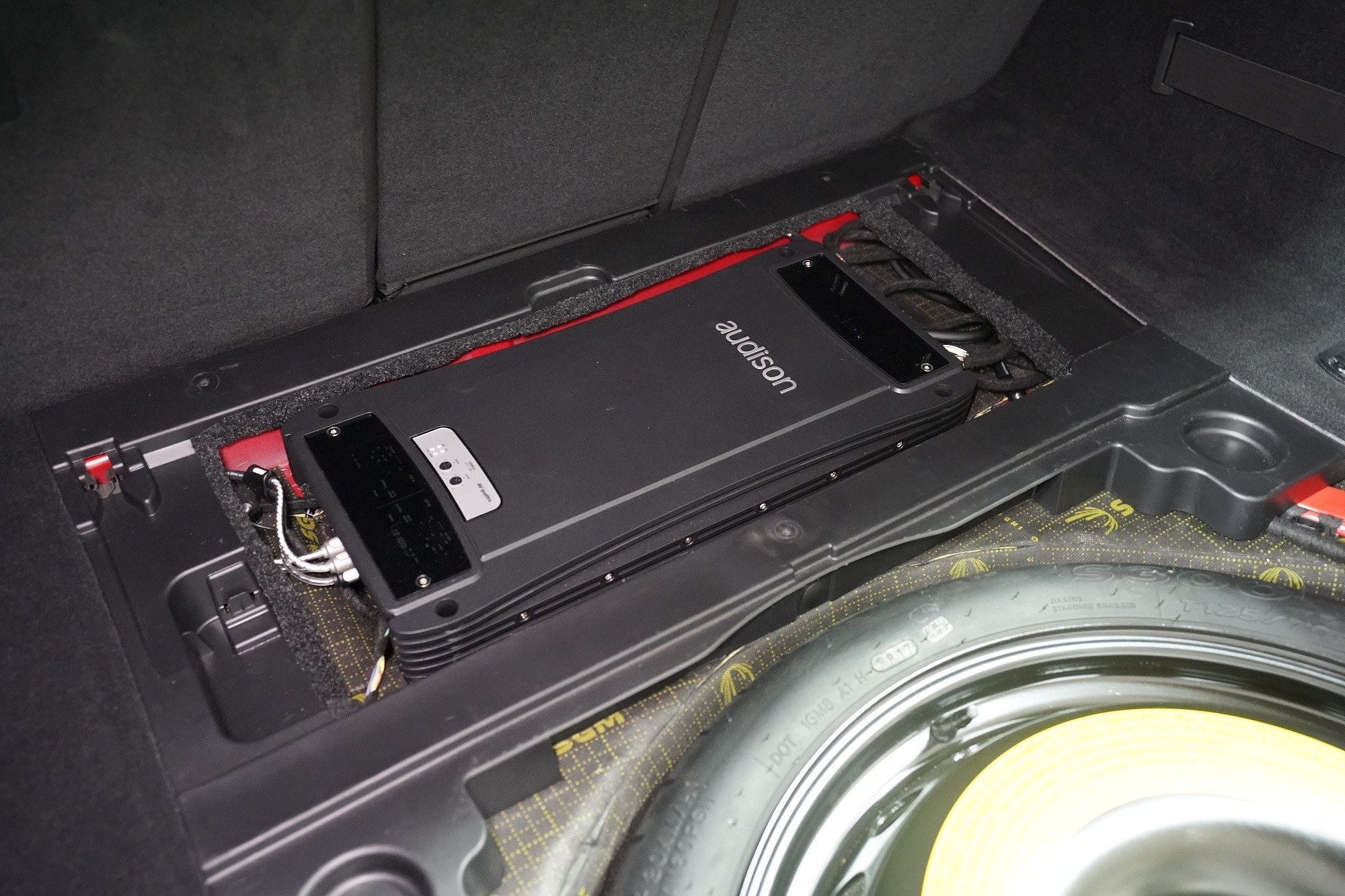 Interiér již máme složený a můžeme se podívat na instalaci jednotlivých komponent. Čtyřkanálový zesilovač Audison AV Quattro pro přední komponentní systém bude skrytý ve dvojitém dně zavazadlového prostoru. První část požadavku na instalaci bez jakéhokoliv narušení prostoru v kufru tedy plníme.