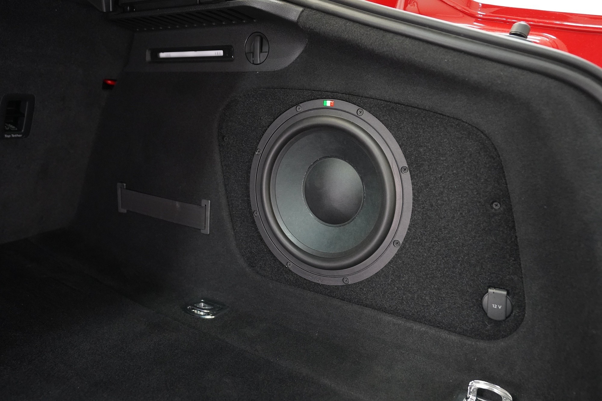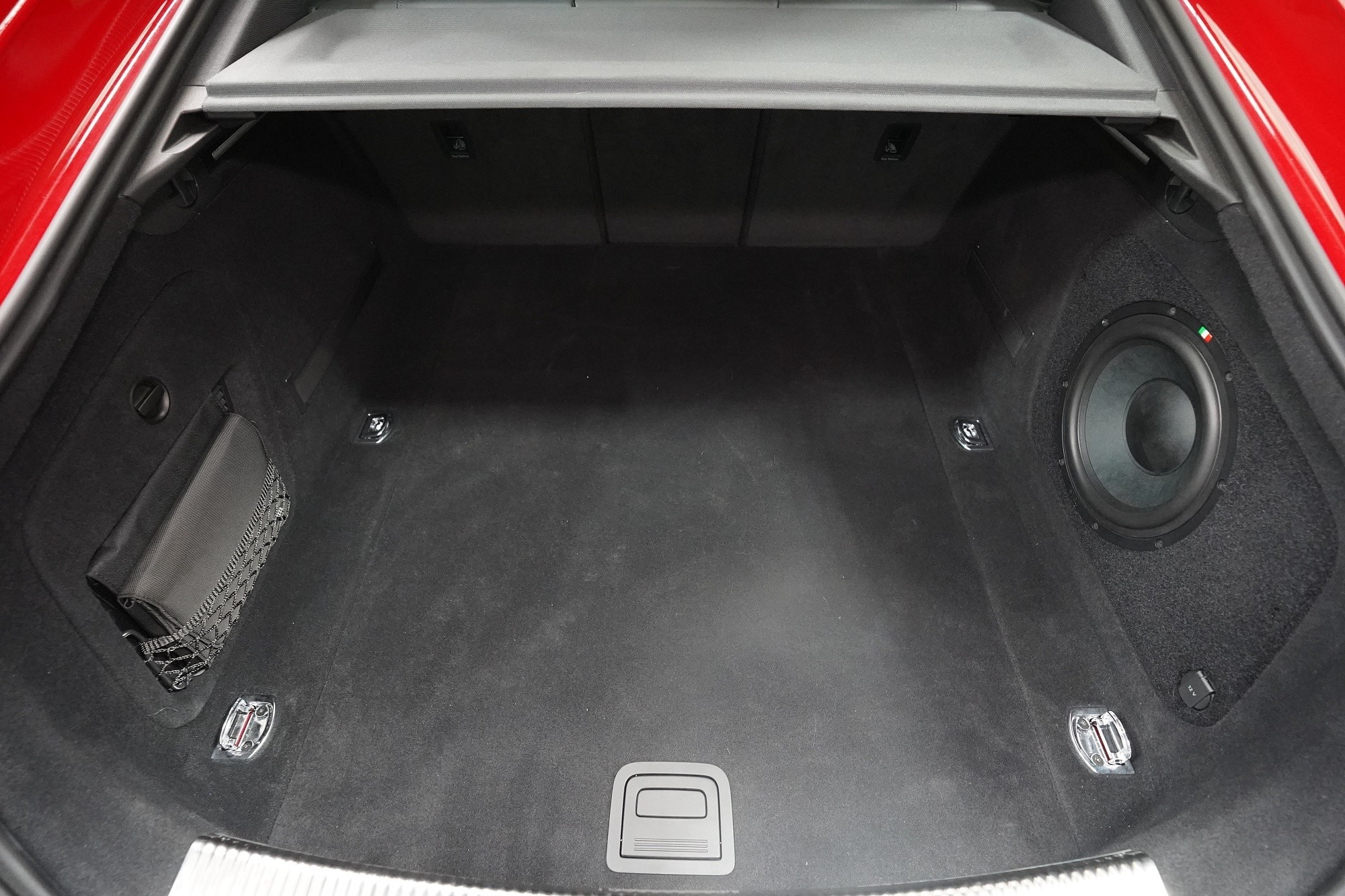 Prakticky jedinou přiznanou komponentou je subwoofer Steg, který je sice vidět, ale nezabírá žádný prostor v kufru. Je to díky speciální MDF ozvučnici vyrobené přímo pro tento model vozu, která je implementovaná do bočnice zavazadlového prostoru.