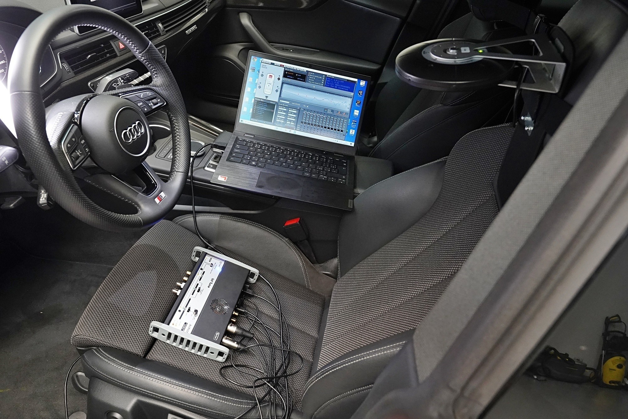 Blížíme se k finiši a tím je naladění zvuku. Pro naprosto precizní nastavení se nespoléháme pouze na vlastní uši, ale i na profesionální techniku určenou pro tyto účely. A k tomu nám slouží systém automatické kalibrace procesorů Audison Bit Tune, který díky několika mikrofonům a funkcím pro elektroakustické ověření a analýzu zvuku zajistí vynikající úroveň akustického výstupu, s naprostou přesností nastaví časové korekce, naladí optimální křivku ekvalizéru, zjistí i možné chyby v nastavení i zapojení a umožní nám soustředit se pouze na perfektní doladění systému. Před předáním vozu zvuk finálně ještě mírně upravíme dle požadavků zákazníka.