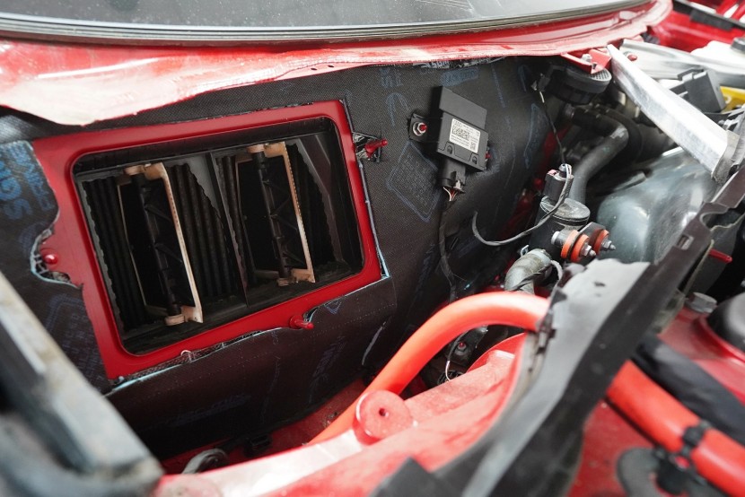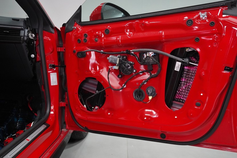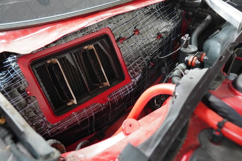 Také odhlučnění torpéda může přinést zajímavé výsledky. Stěrače jsou zdrojem silných vzduchových turbulencí a prostor pod spodním okrajem čelního skla je často veliký. Vytváří se zde efekt zvuku v jeskyni a to v bezprostřední blízkosti interiéru. Druhým důvodem k odhlučnění torpéda je snížení hluku od motoru. Nejprve tradičně aplikujeme antivibrační materiál, konkrétně SGM Onyx 3, který odfiltruje silné vibrace motoru.