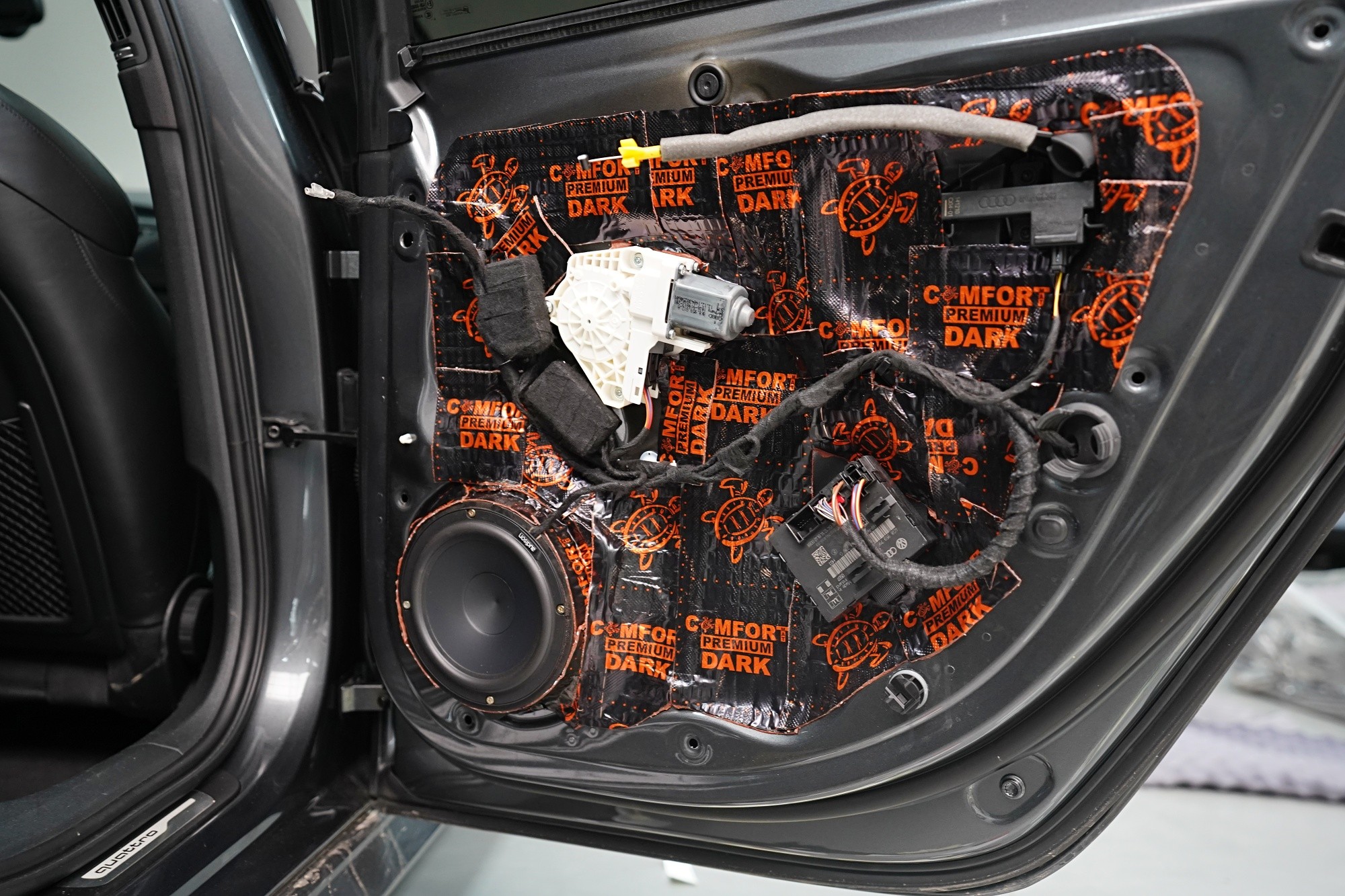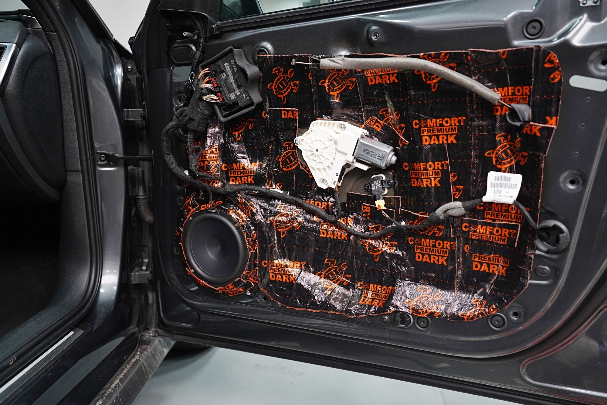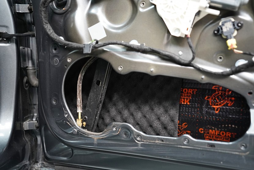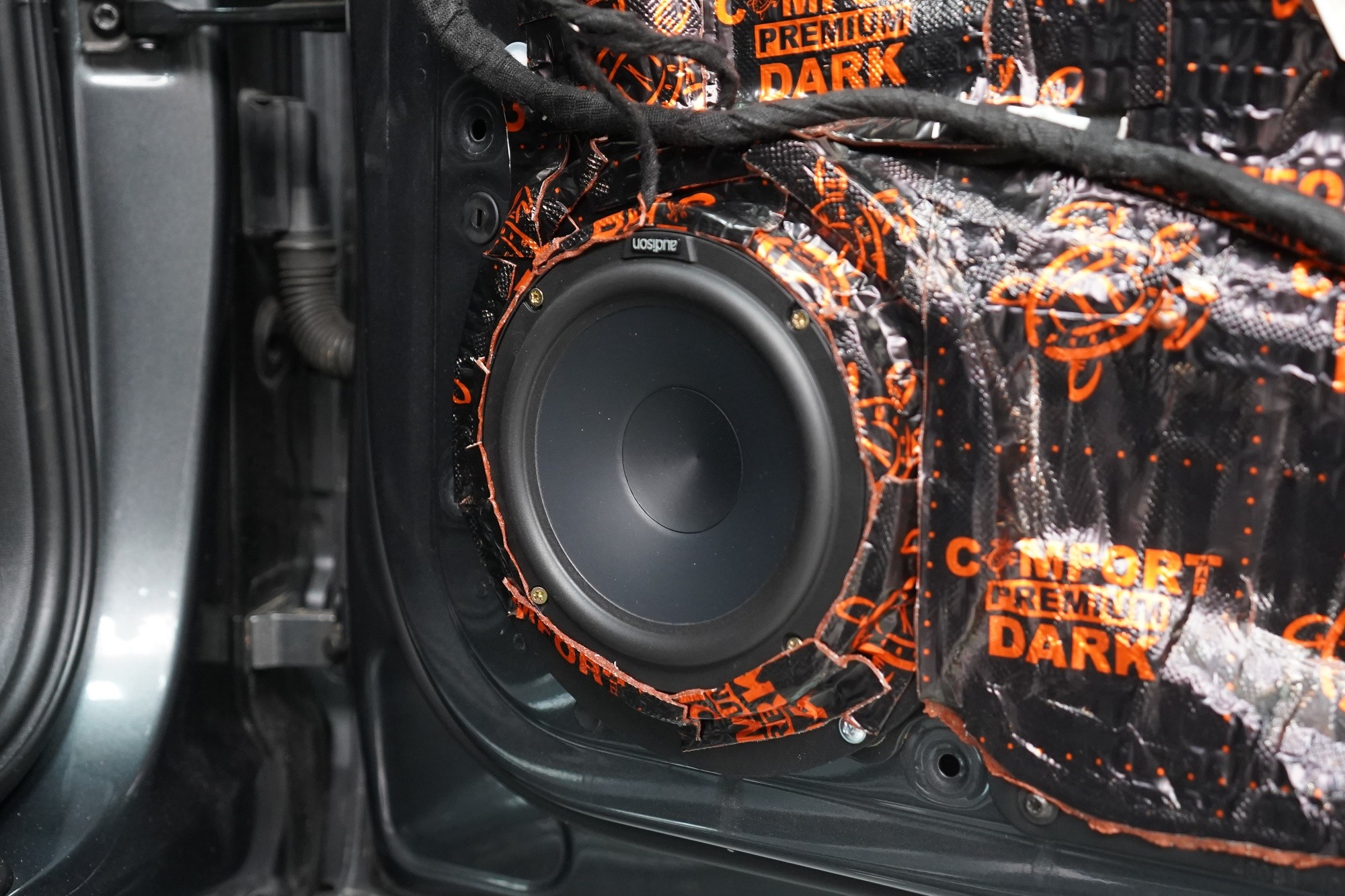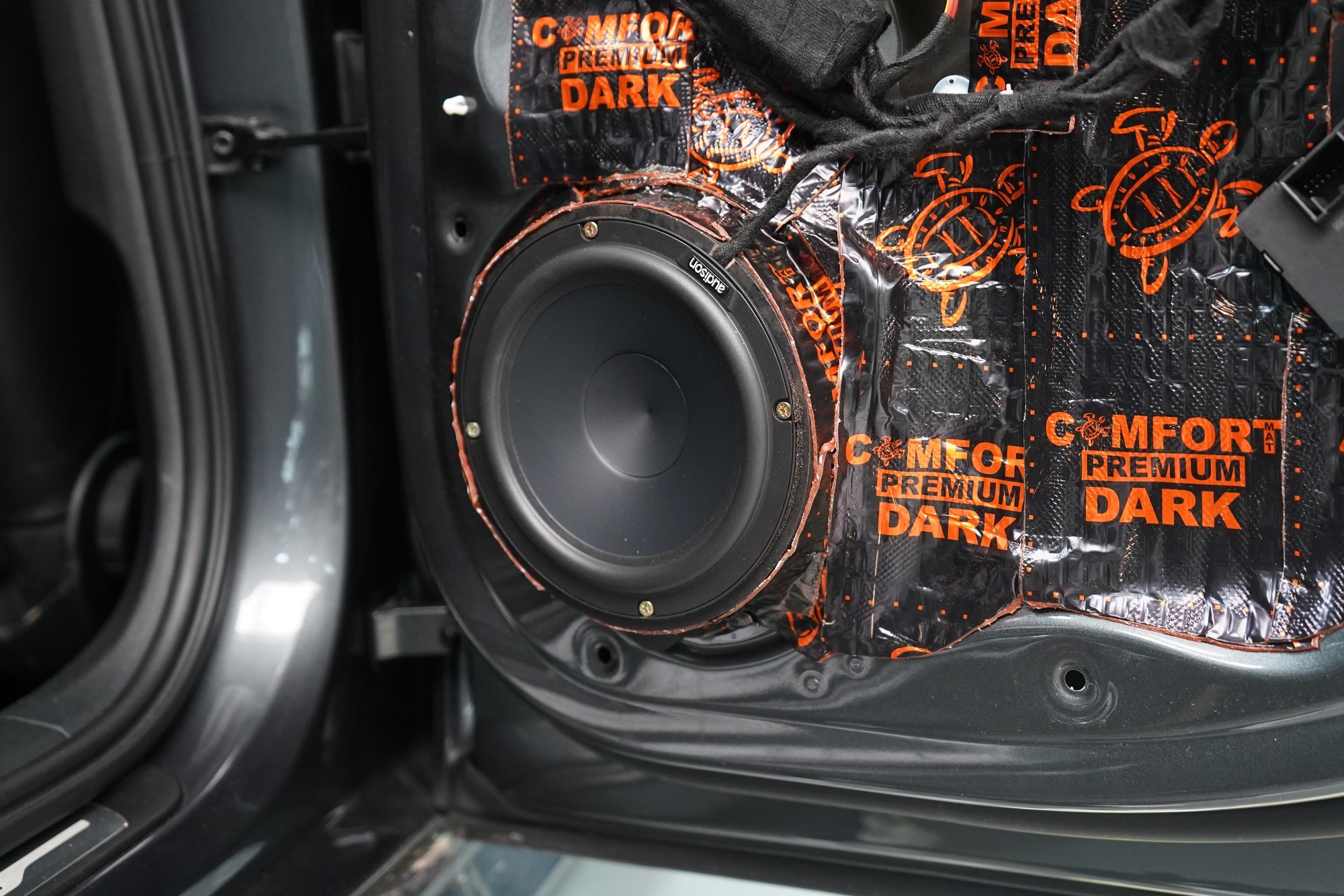 Důležitou součástí instalace je tlumení dveří, které má za následek výrazně zlepšení zvuku středobasových reproduktorů a to zejména jejich basové složky. První vrstvou je antivibrační materiál Comfortmat D2, který vnější plech dveří zpevní a zamezí vibracím. Jedná se o prémiový a velmi lehký materiál, který zbytečně nezatěžuje dveře, je absolutně voděodolný a mimo jiné má i antikorozní vlastnosti.