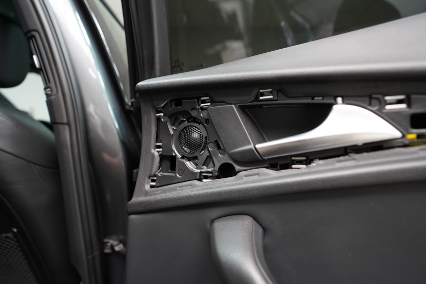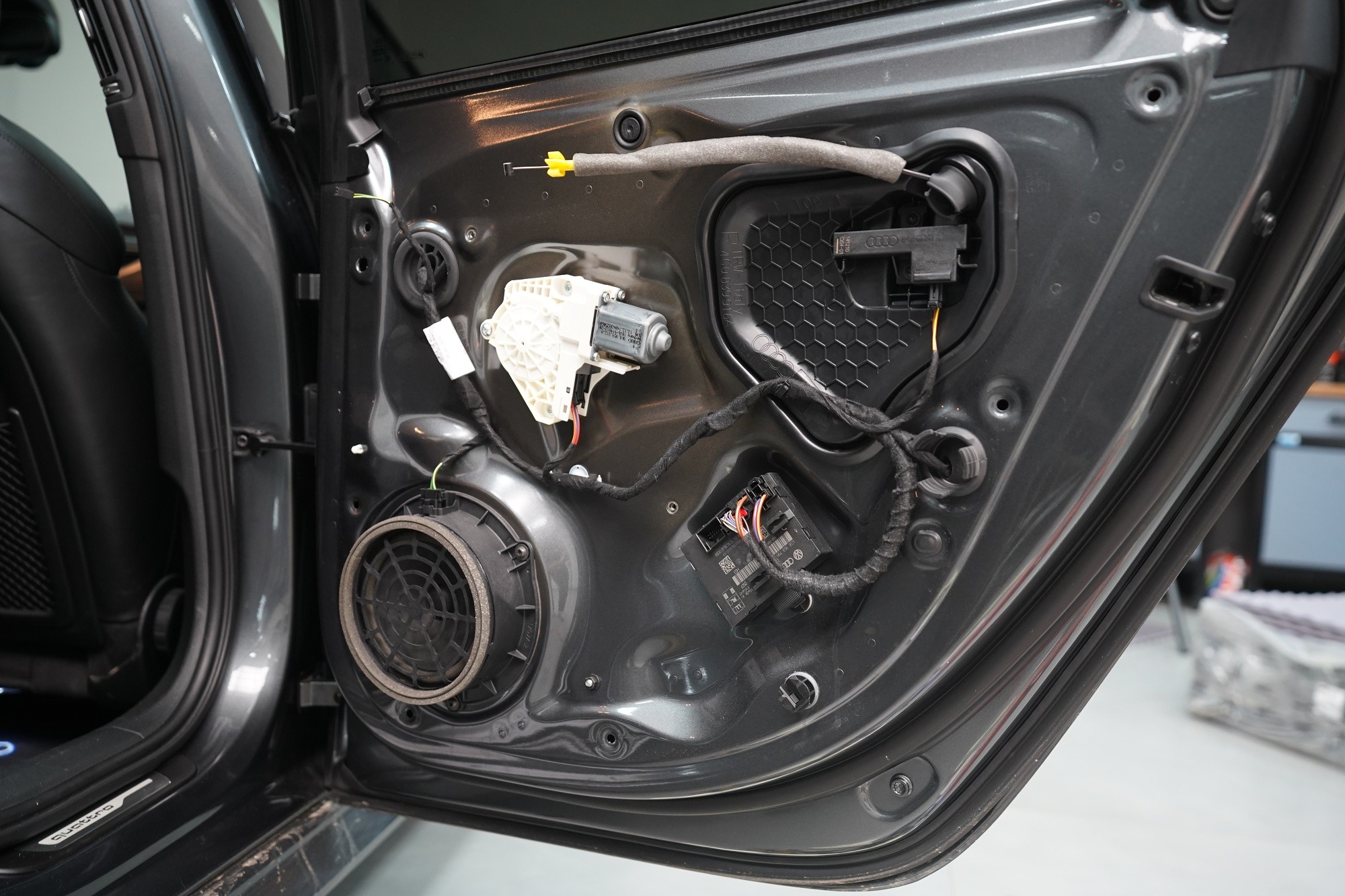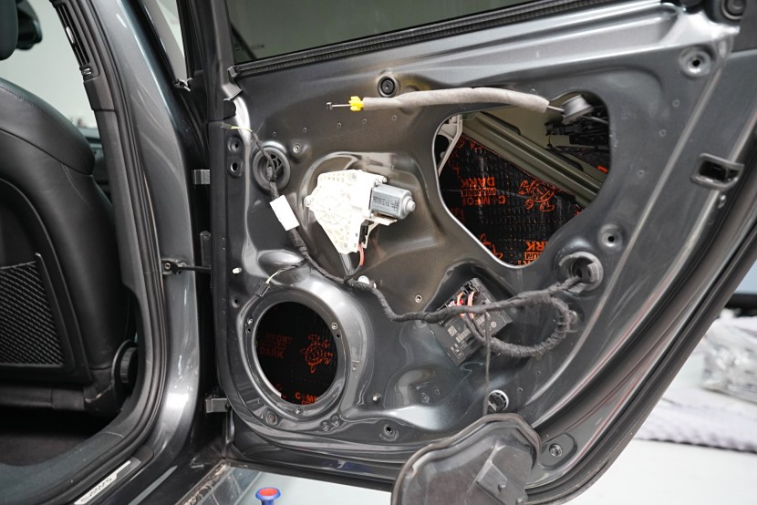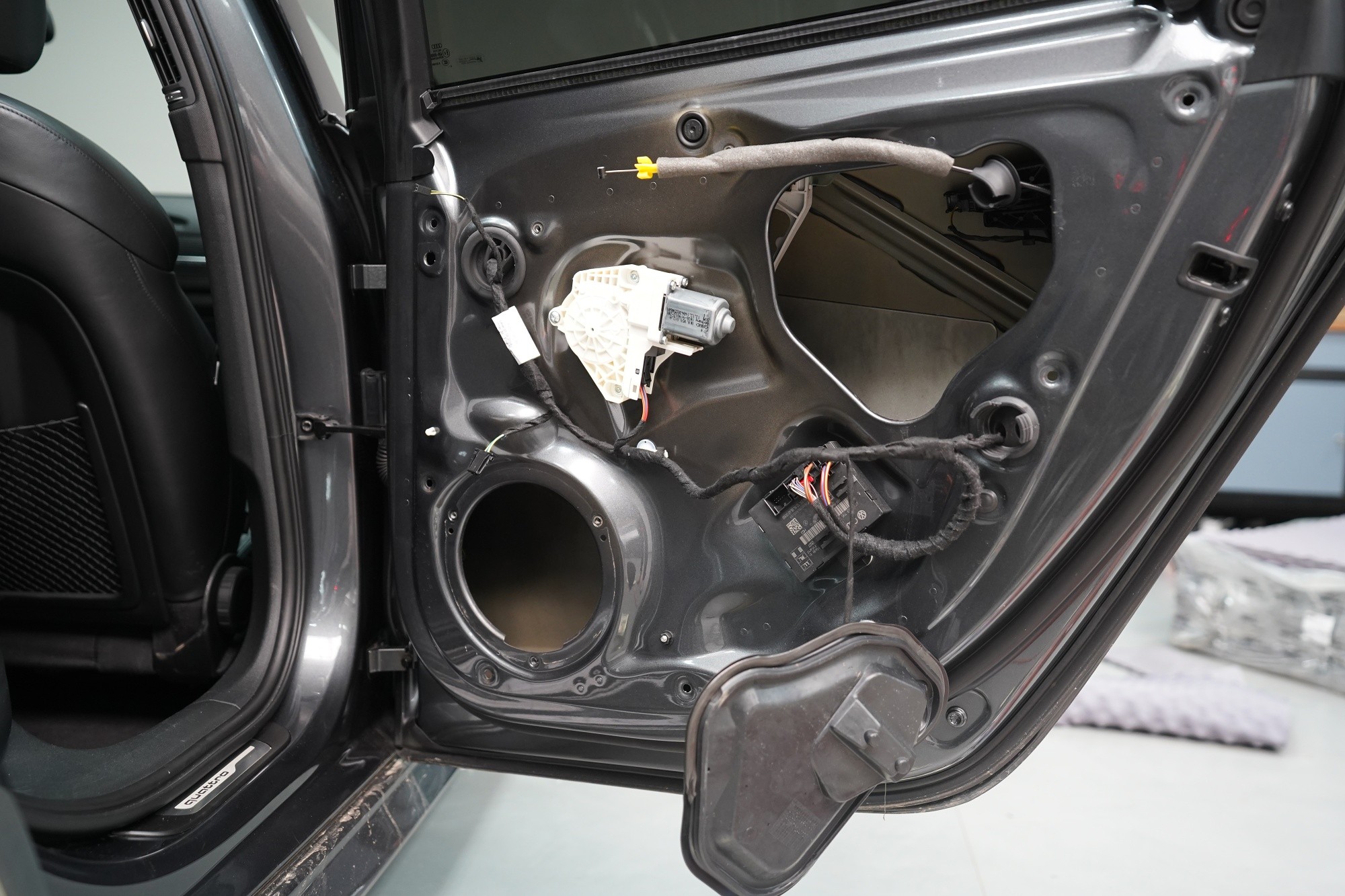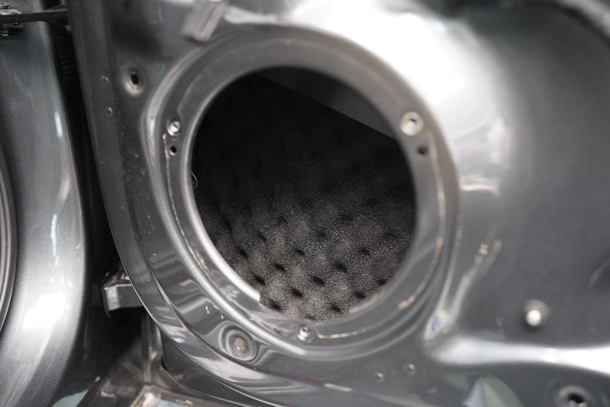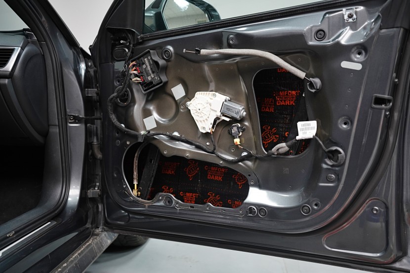 Důležitou součástí instalace je tlumení dveří, které má za následek výrazně zlepšení zvuku středobasových reproduktorů a to zejména jejich basové složky. První vrstvou je antivibrační materiál Comfortmat D2, který vnější plech dveří zpevní a zamezí vibracím. Jedná se o prémiový a velmi lehký materiál, který zbytečně nezatěžuje dveře, je absolutně voděodolný a mimo jiné má i antikorozní vlastnosti.