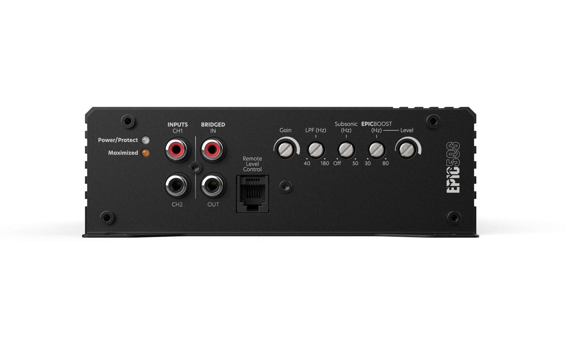 Zesilovače AudioControl řady EPIC kombinují vysoký výkon, kompaktní rozměry a stabilní provoz při nízké impedanci. Jsou navrženy pro pohon subwooferů a výkonných reproduktorů a díky digitální technologii Class-D poskytují účinný přenos energie i při náročném zatížení. Model Epic500 nabízí stabilitu až do 1 Ω, variabilní filtry a možnost nastavení basového posílení, takže umožní přesně doladit basovou složku podle potřeby. Součástí je dálkový ovladač ACR-E pro regulaci úrovně basu přímo z místa řidiče. Zesilovač je dále vybaven ochrannými obvody proti přetížení, přepětí, podpětí nebo přehřátí, což zajišťuje spolehlivý a dlouhodobý provoz. Pro instalaci jsou připraveny masivní napájecí a reproduktorové terminály s pevnými šroubovými spoji. Epic500 lze také propojit s procesorem The Epicenter Bass Restoration, který rozšiřuje možnosti nastavení a basového projevu.
