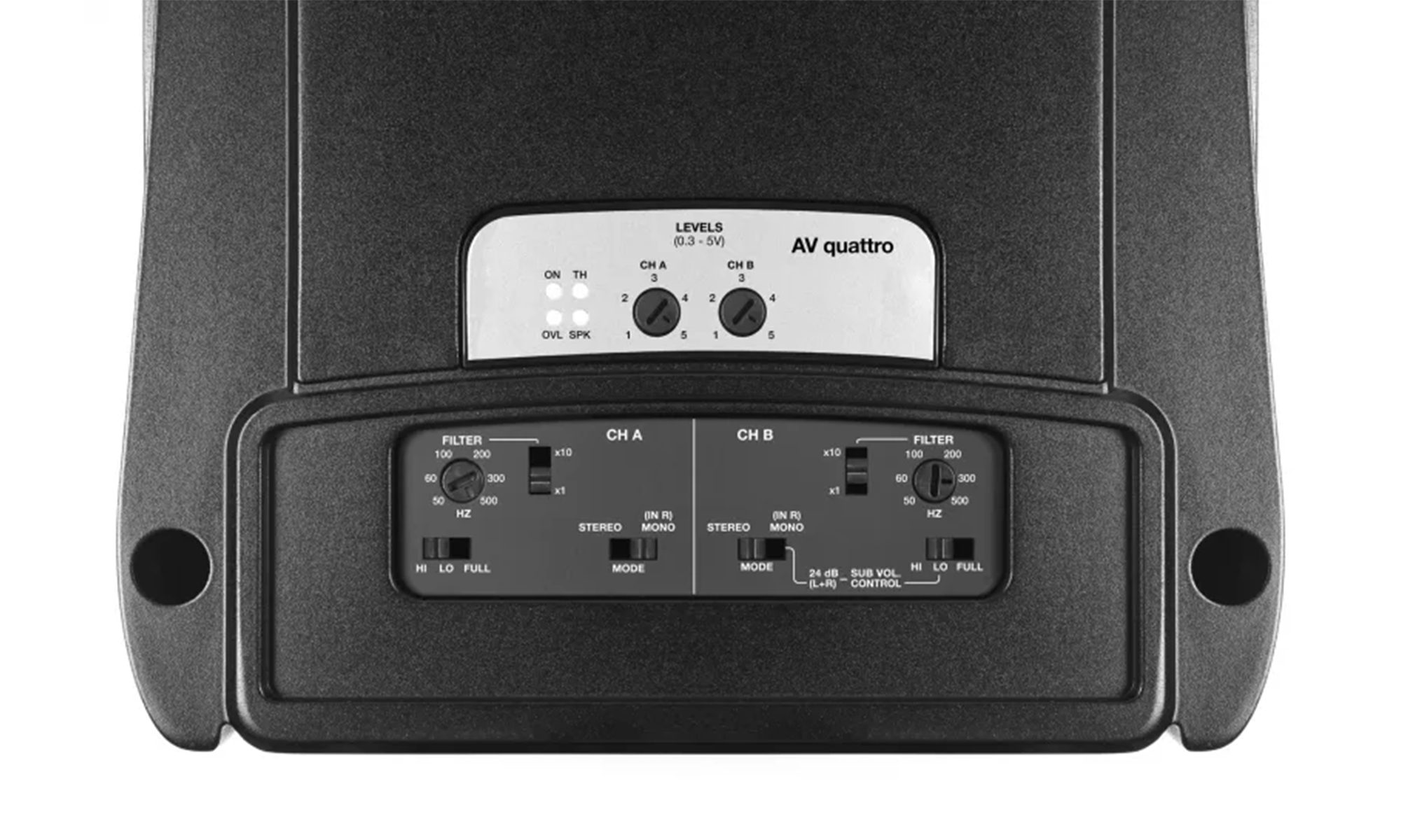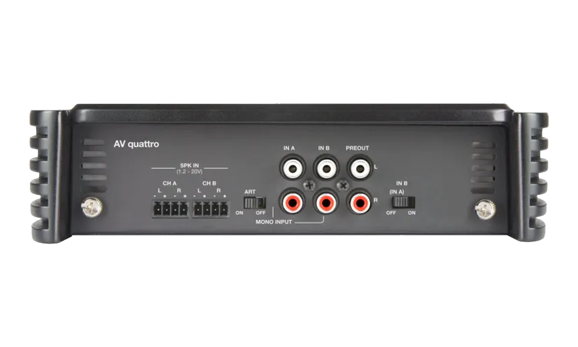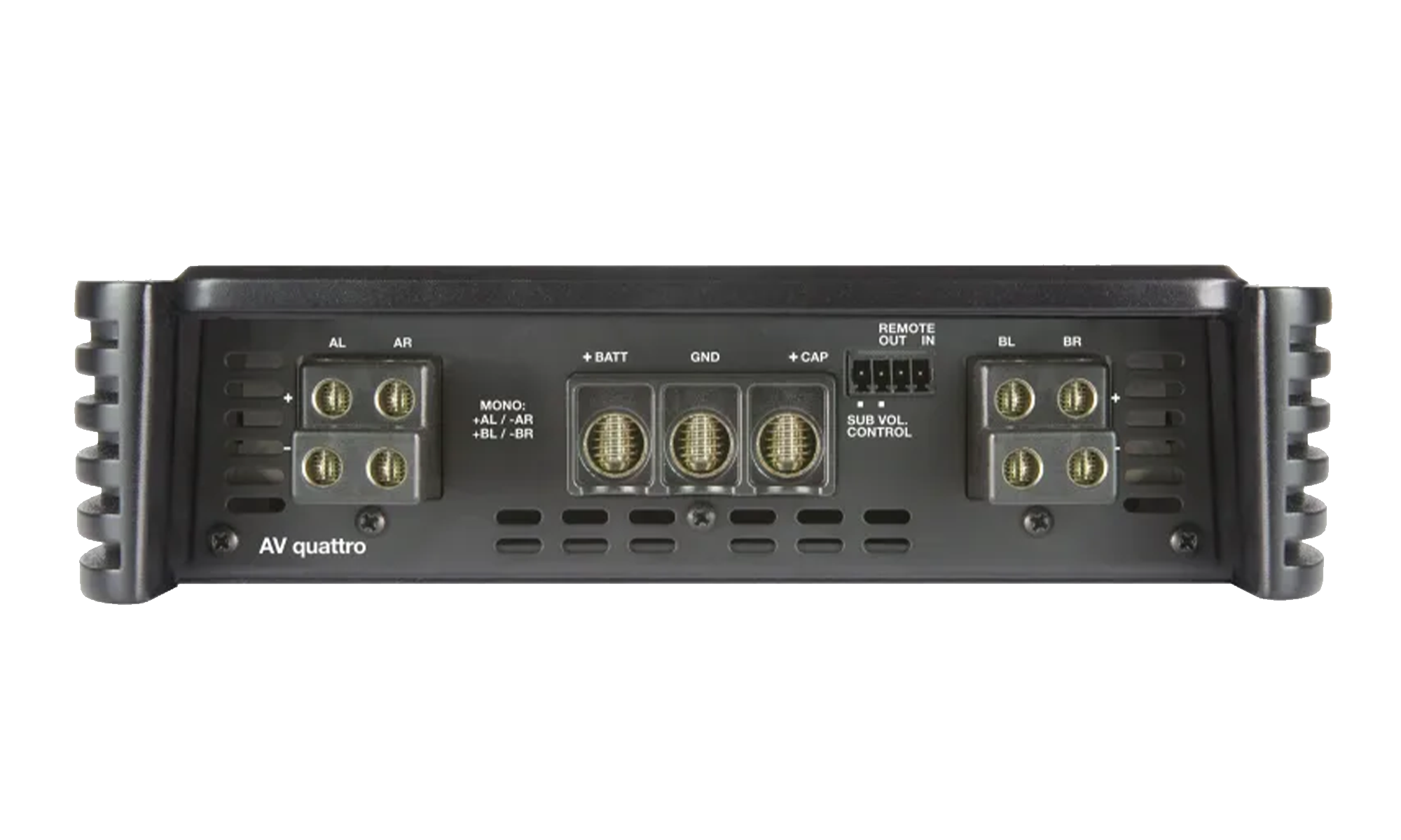 AV quattro je čtyřkanálový zesilovač, který může pracovat ve čtyř, tří a dvoukanálovém režimu a poskytuje celkový výkon 1700 W (RMS). Je navržen tak, aby zvládal složité konfigurace jako přední / zadní a vícekanálové systémy. AMP (Amplifier Management Processor) neustále kontroluje operační systém a komunikuje s uživatelem pomocí 4 různých barevných LED diod umístěných na horním panelu. ART (Automatic Remote Turn On-Off) umožňuje automatické zapnutí / vypnutí, pokud není signál ze zdroje k dispozici. Vstupy a ARTTM zajišťují propojení s každým typem zdroje. AV quattro také umožňuje nahradit analogovou vstupní desku digitální deskou (AV bit IN).O značce