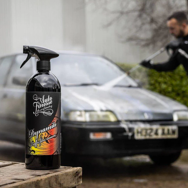 Auto Finesse Dynamite Traffic Film Remover je koncentrát, přípravek na předmytí automobilu, vhodný k ředění v poměru 1:5 až 1:10. Koncentrované citrusové předmytí je vhodné pro odstranění silničního znečištění a hmyzu z vnějších povrchů vozidla, a to jak z laku, plastu, skla, alu kol atd. Ačkoliv je Dynamite velmi efektivní, je také velmi šetrný k naneseným voskům a sealantům právě díky možnosti ředění. Dynamite Traffic Film Remover je ideální pro nejbezpečnější způsob mytí, pro bezkontaktní mytí. Díky používání aktivního předmytí udržíte kondici laku stále ve výborném stavu. Tak jako všechny produkty Auto Finesse, tak i Dynamite patří mezi profesionální produkty určené pro zkušené detailery. Díky vysoké efektivitě a snadnosti aplikace dosáhne s tímto přípravkem skvělých výsledků i začátečník.