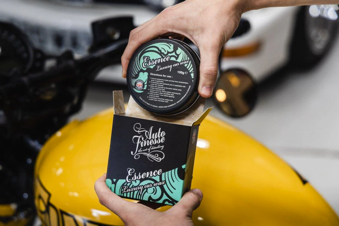 Essence je ručně vyráběný vosk ve Velké Británii, kde je přísně dodržován poměr pravé brazilské sušiny karnauby, syntetických polymerů a olejů. Vosky se používají k ošetření vozidla proti působení negativních vlivů přírody. Důležitá je také odolnost proti UV záření, vodoodpudivost, odolnost proti kyselým dešťům, ptačímu trusu atd. Auto Finesse Essence obsahuje 40 % T1 třídy brazilského karnaubského vosku, přičemž zbývající podíl je tvořen ze syntetických polymerů a olejů. Tento vosk byl vyvinut pro opravdovou hloubku laku a vysoký lesk. Obsah netěkavých součástí vosku poskytuje Essenci životnost až 3 měsíce od aplikace, a to u automobilu při každodenním používání. Perfektní vodoodpudivost vás přímo nutí sledovat kapky vody při dešti, které se mění v malé kuličky, stékající bez zanechání vodního spotu na laku. Vosk Essence je vhodný pro tmavé a teplé odstíny barev laků. Vhodný pro použití jak na automobily, tak i na motocykly.