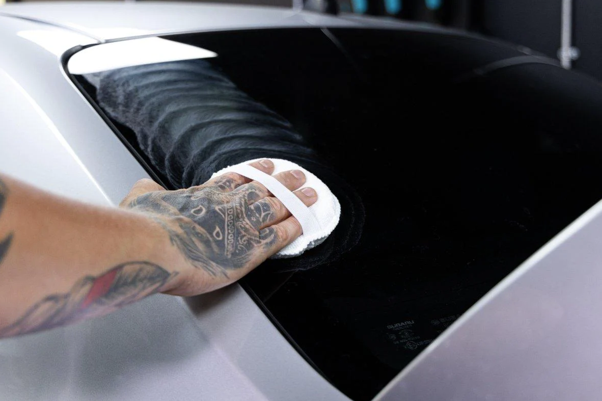 - Aplikujte dvě kapky velikosti hrášku na mikrovláknový aplikátor a rovnoměrně rozetřete na okno krouživými pohyby.
