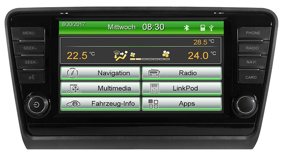 - Podpora propojení s displejem MDF, originálními parkovacími senzory a climatronic
