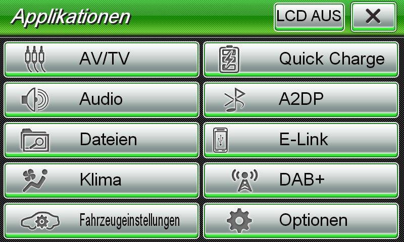 | Podporované formáty přes CD/-R/-RW diskSeznam všech podporovaných formátů (MP3, AAC, Flac, DivX atd.), které autorádio umí přehrát přes CD nebo DVD mechaniku. | DVD, DVD-R/RW, DVD+R/RW, VCD, CD, CD-Text, CD-R/RW, MP3 |