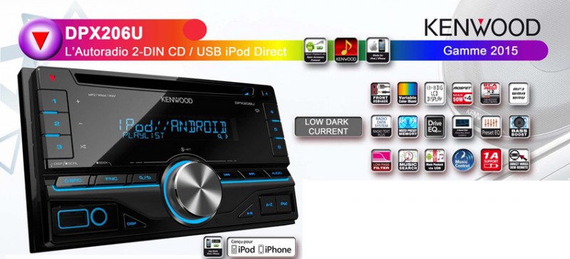 2DIN • RDS • 4 X 50W • MP3/WMA/AAC/WAV dekodér • 2 RCA Pre-outy (2.5V) • 24 bit DAC • 14 Seg 13+8 digit LCD Display • Přední AUX & USB vstup • Drive EQ • Bass Boost & Loudness • Low-pass Filter • Kenwood Sound Reconstruction • Variabilní podsvícení (24 přednastavených barev) • Přímé ovládání iPod & iPhone s volitelným kabelem (30pin KCA-iP102 nebo Lightning KCA-iP103) • Android OAP ready • I/F pro OEM dálkové ovládání