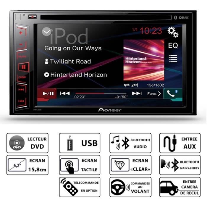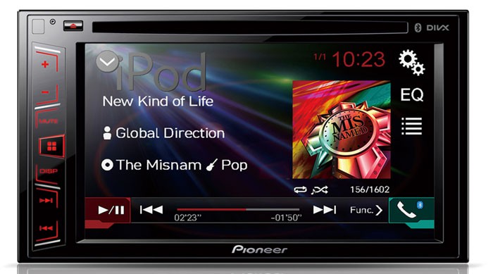 DVD AV systém s technologií Pioneer Bluetooth. Přístroj spolupracuje s iPhone a iPod. 6,2" doteková WVGA obrazovka, 2x RCA výstup, 1x USB/RCA zadníd vstup, RCA video vstup, Video výstup, dopor. DO - CD-R33 pro DVD, přehrává přes CD, DVD a USB - MP3, WMA, WAV, AAC audio, DivX, Xvid and MPEG-1,2,4 video, JPEG a BMP soubory přes USB, 5-ti pásmový graf.ekvalizér, PAL/NTSC/SECAM