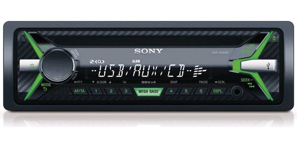 Autorádio SONY rozměru 1DIN s CD přehrávačem, USB vstupem, MEGA BASS EQ5 a výstupním výkonem 4 x 55W, zelená barva podsvícení.