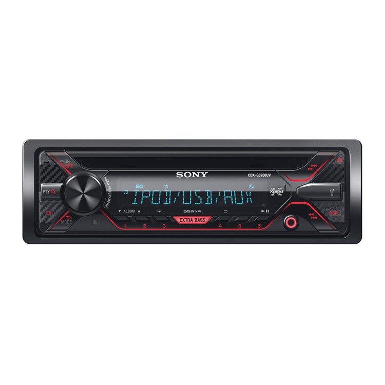Autorádio Sony rozměru 1DIN s CD přehrávačem, USB vstupem, EXTRA BASS EQ10 a výstupním výkonem 4 x 55 W, variabilní podsvícení.